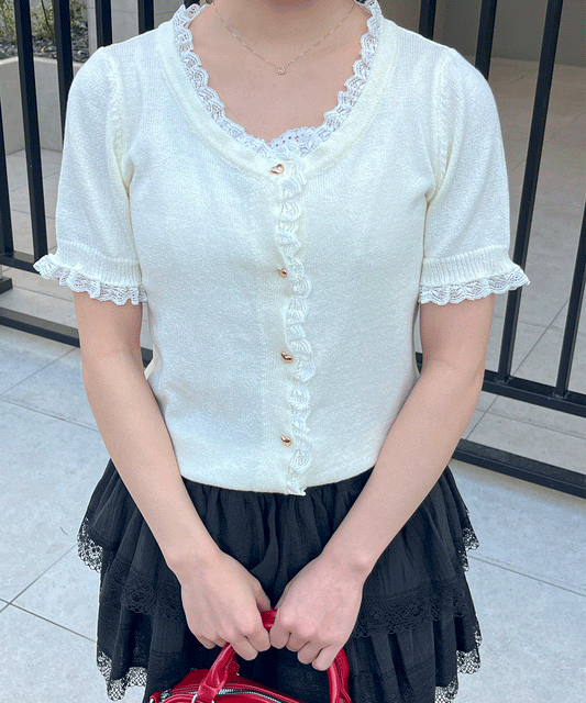 【Official限定価格】フリル付きハートボタン半袖ニット