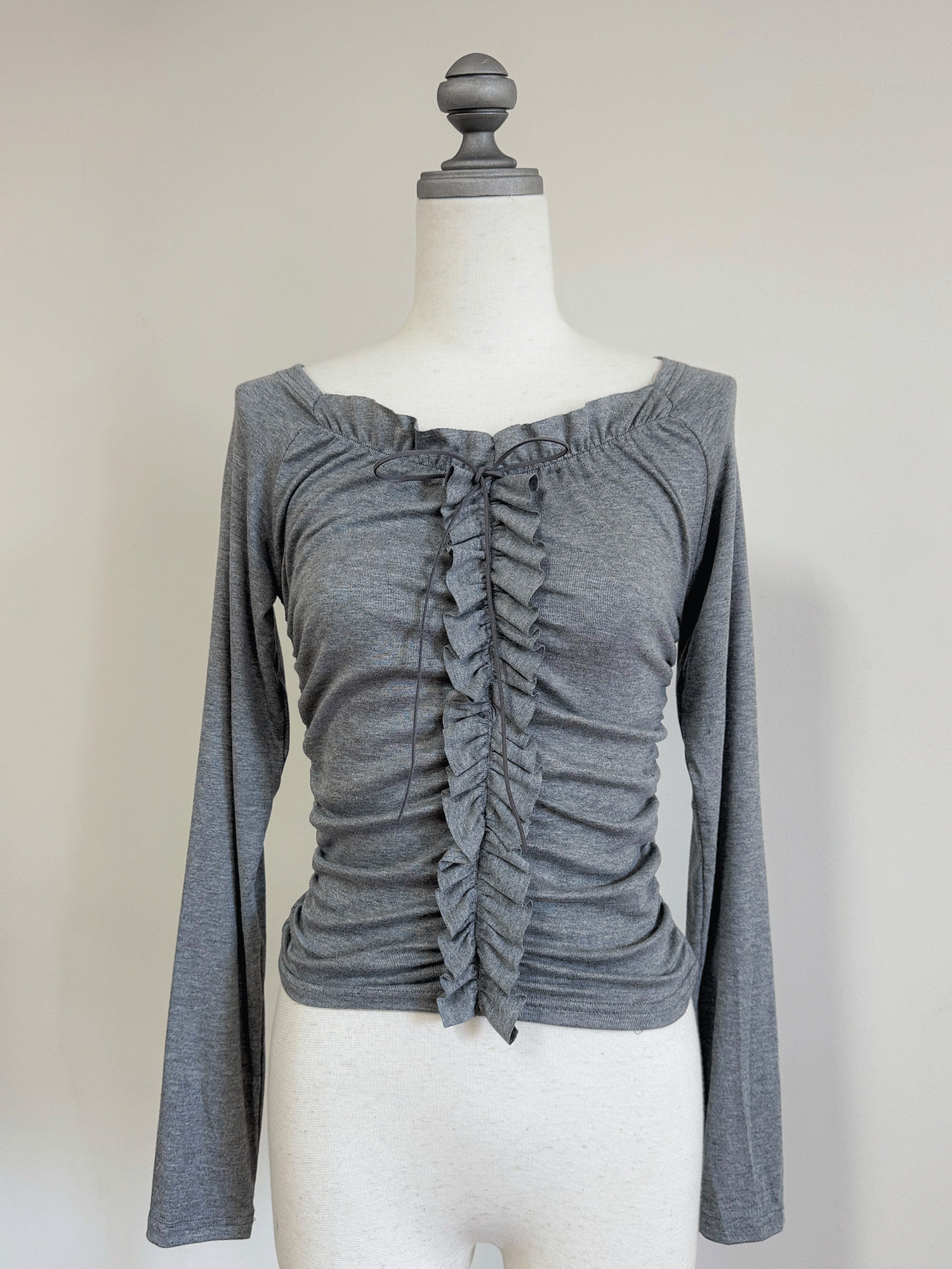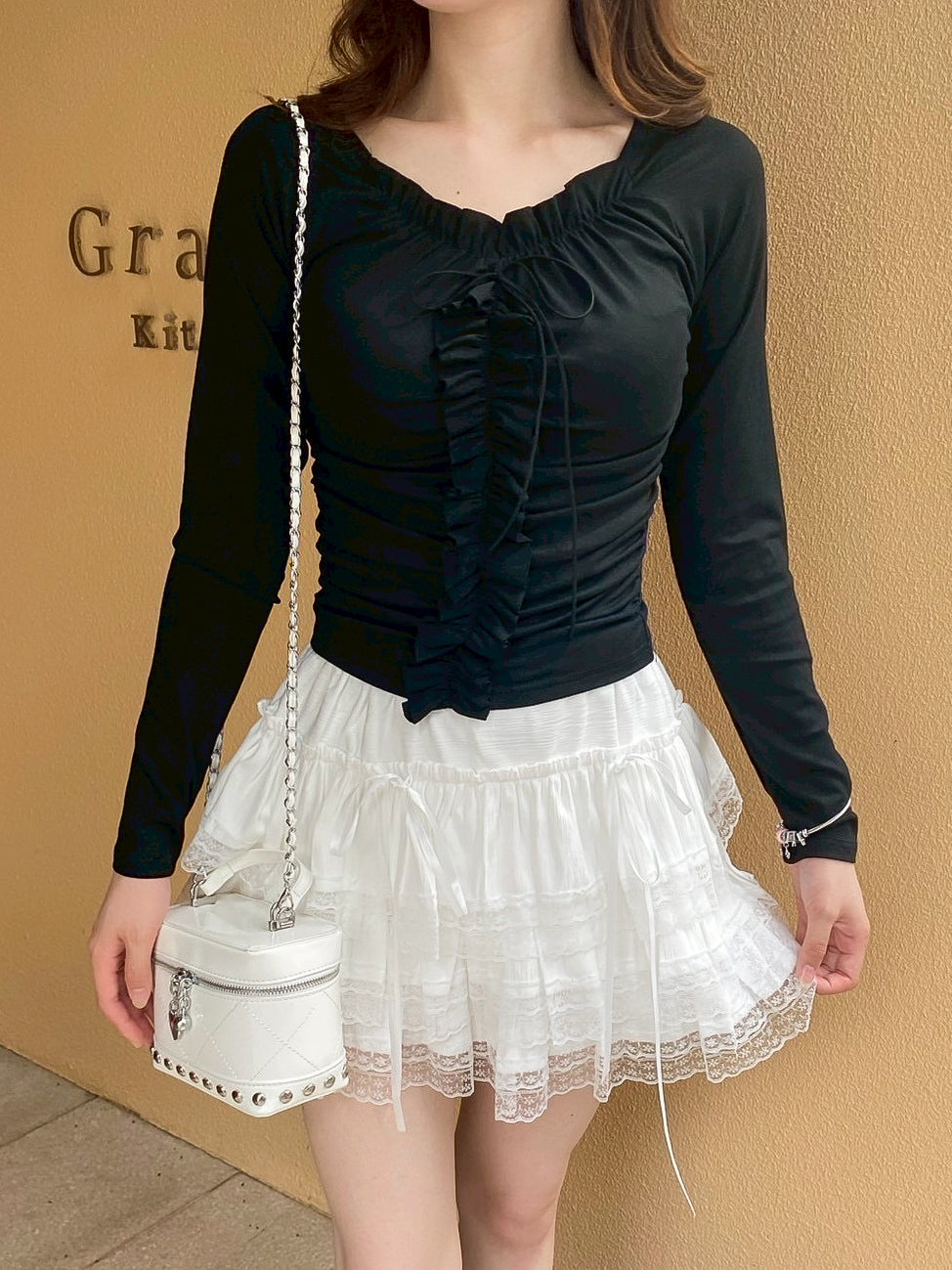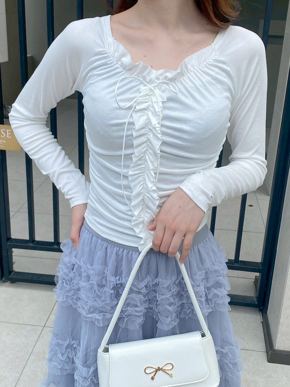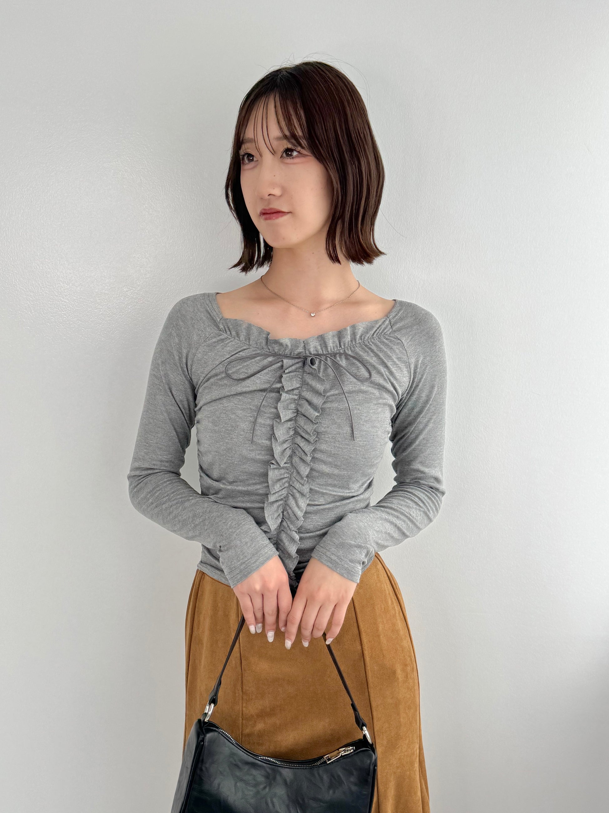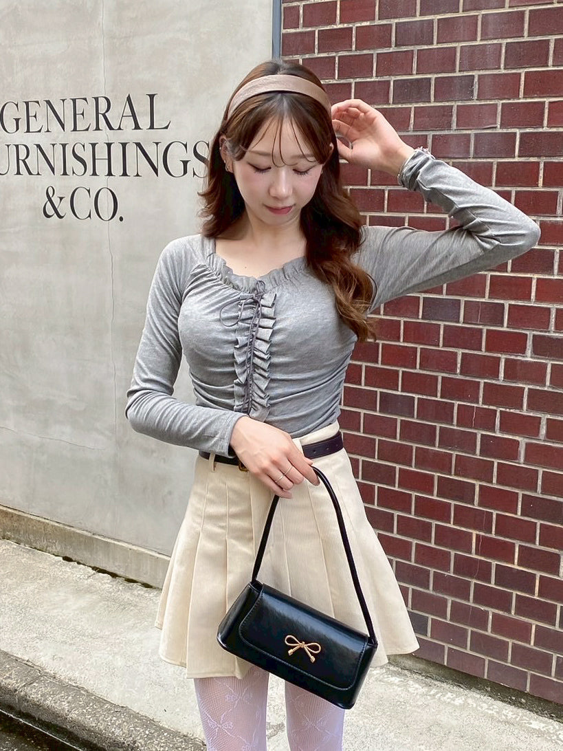 フリルがあしらわれ、ワンポイントにリボンが付いた