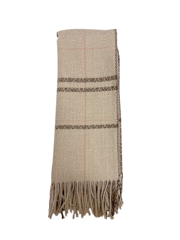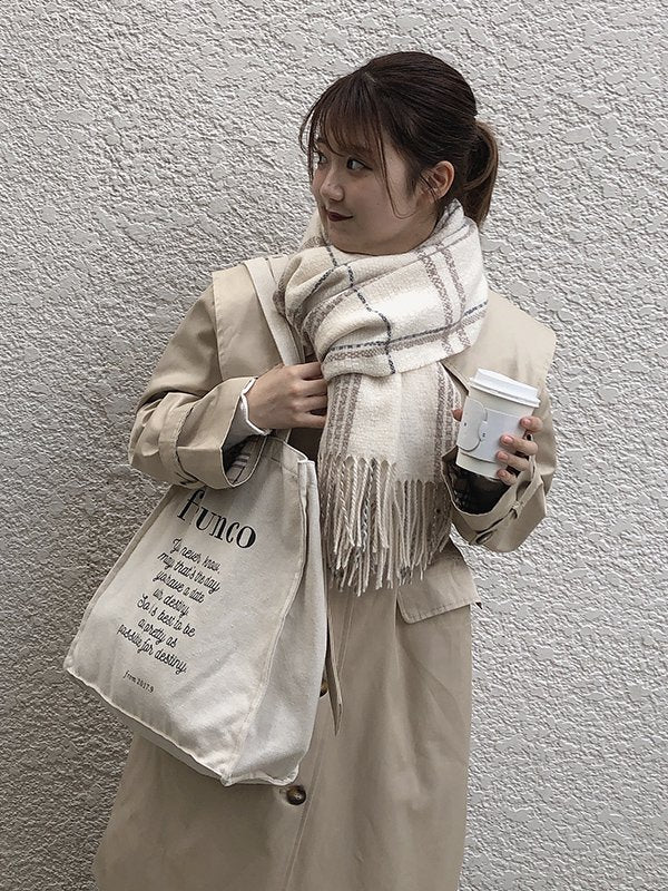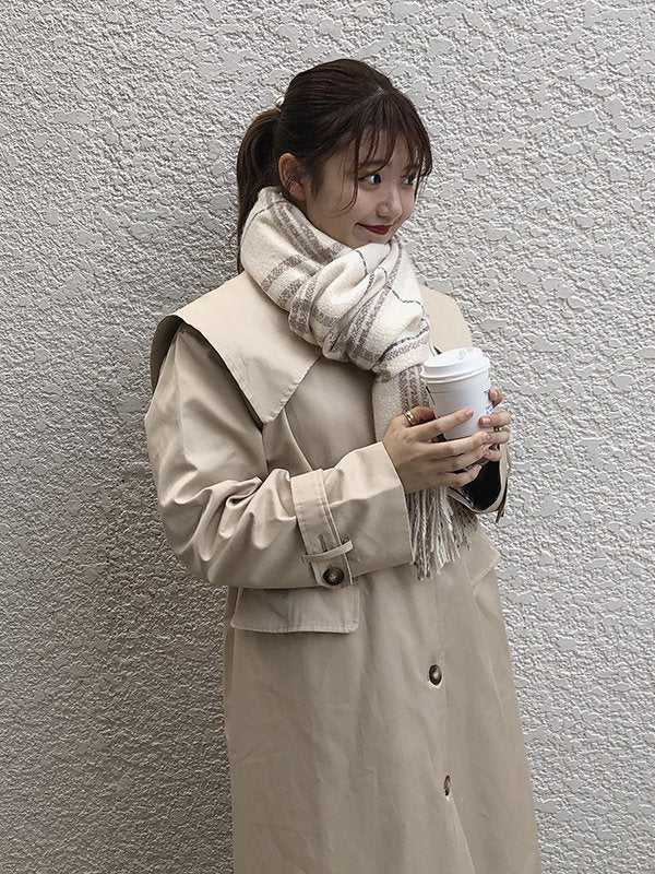 首元までベージュを取り入れて淡色コーデができるマフラー