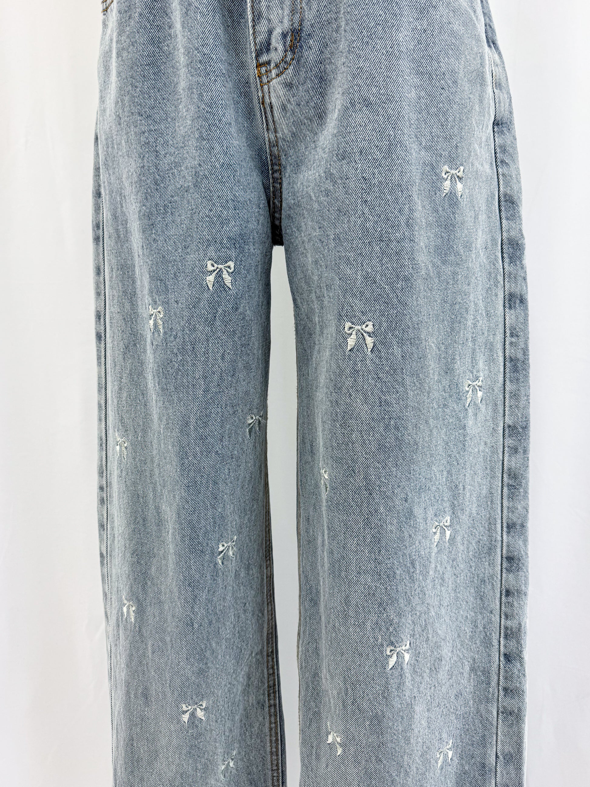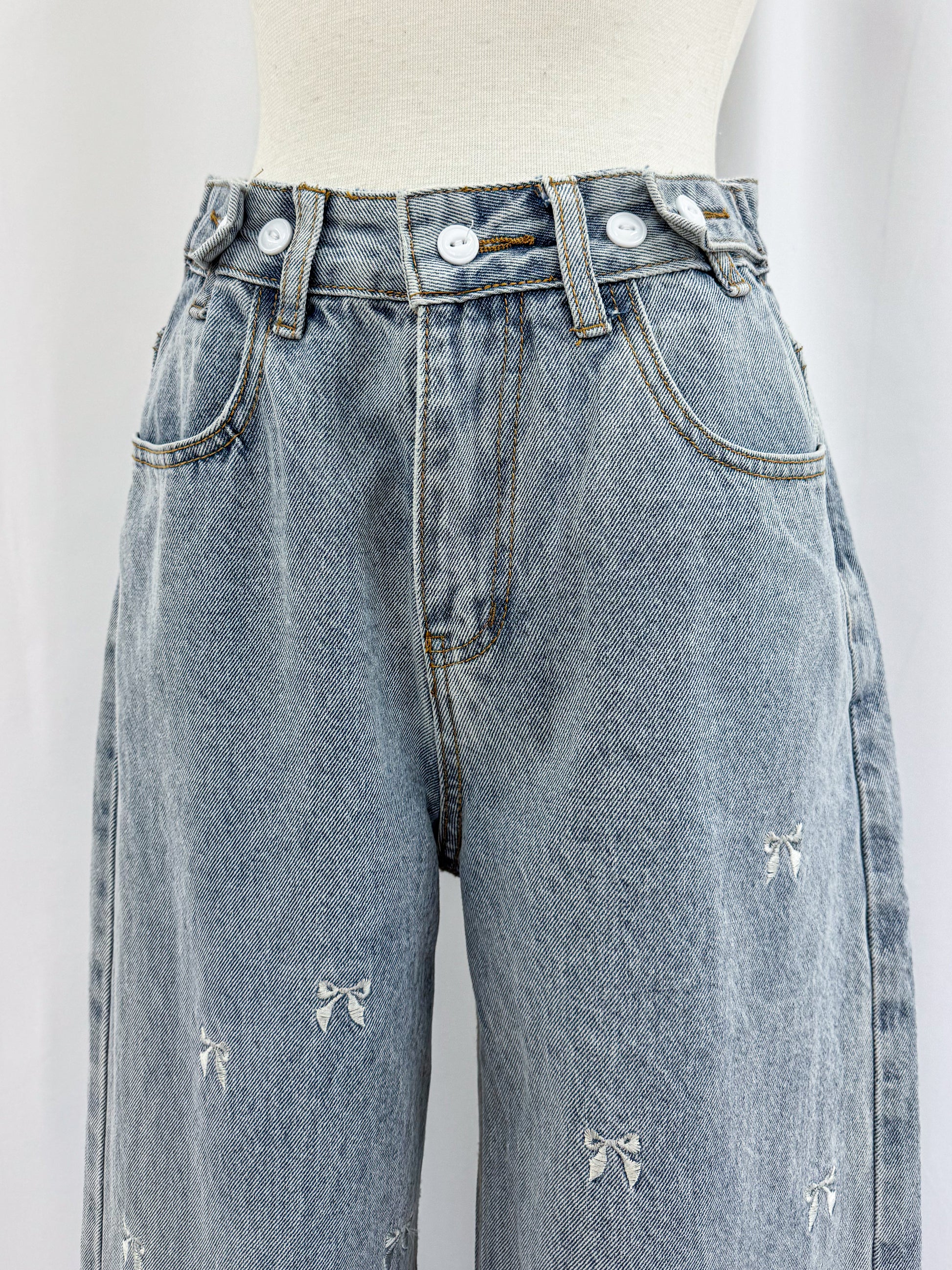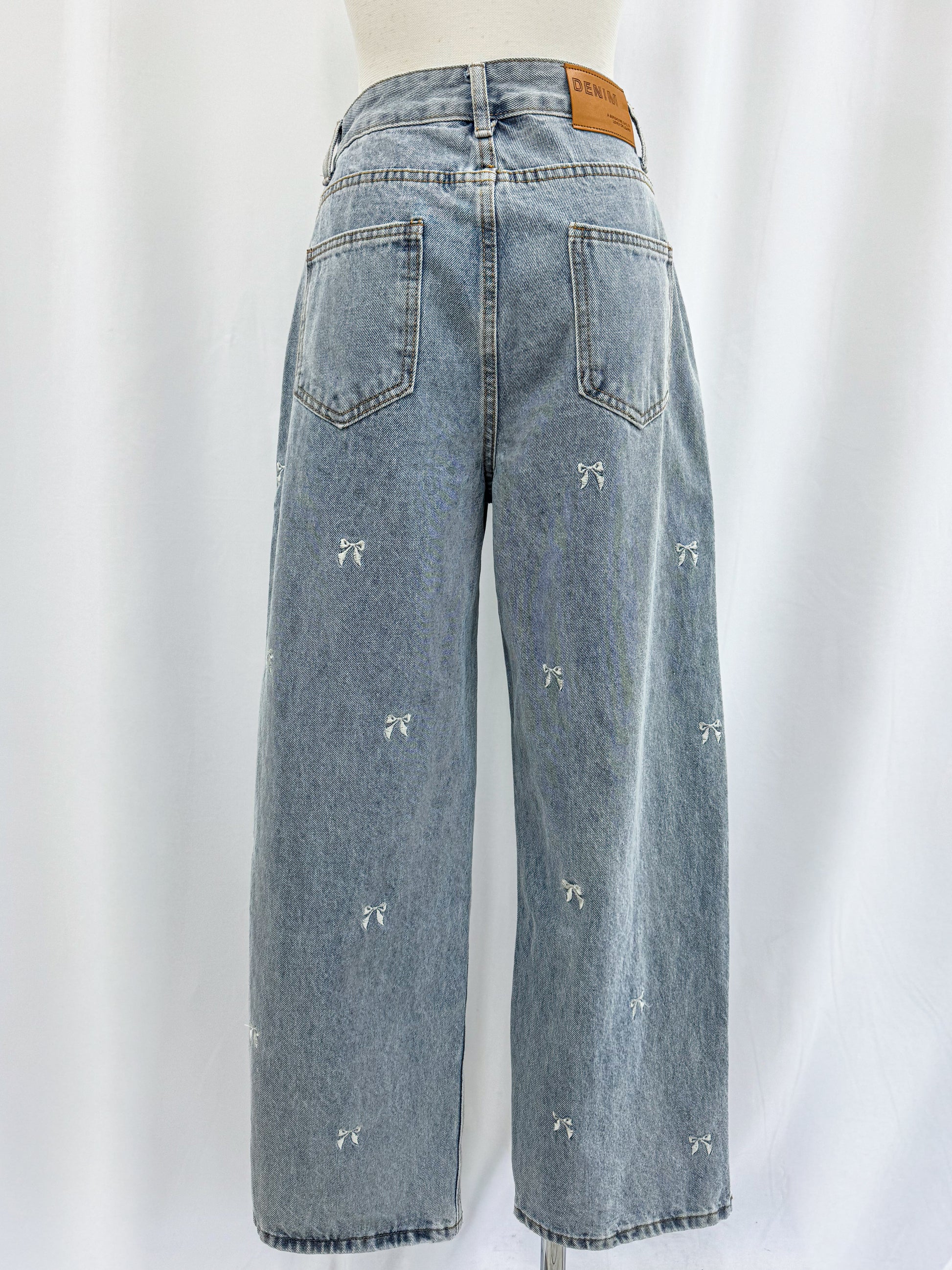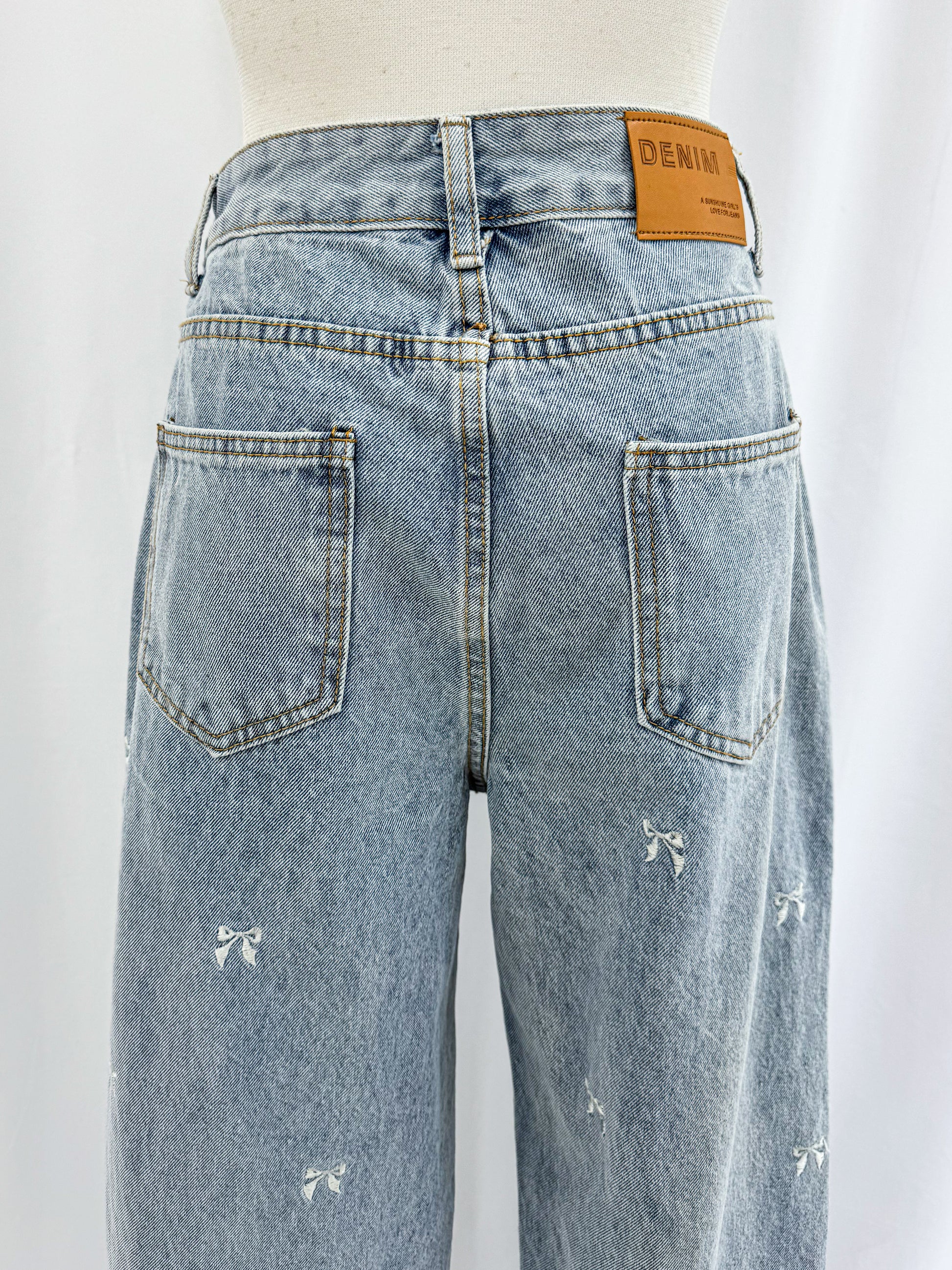 リボンの刺繡が前後に散らばっている可愛い刺繍入りのデニムパンツ。