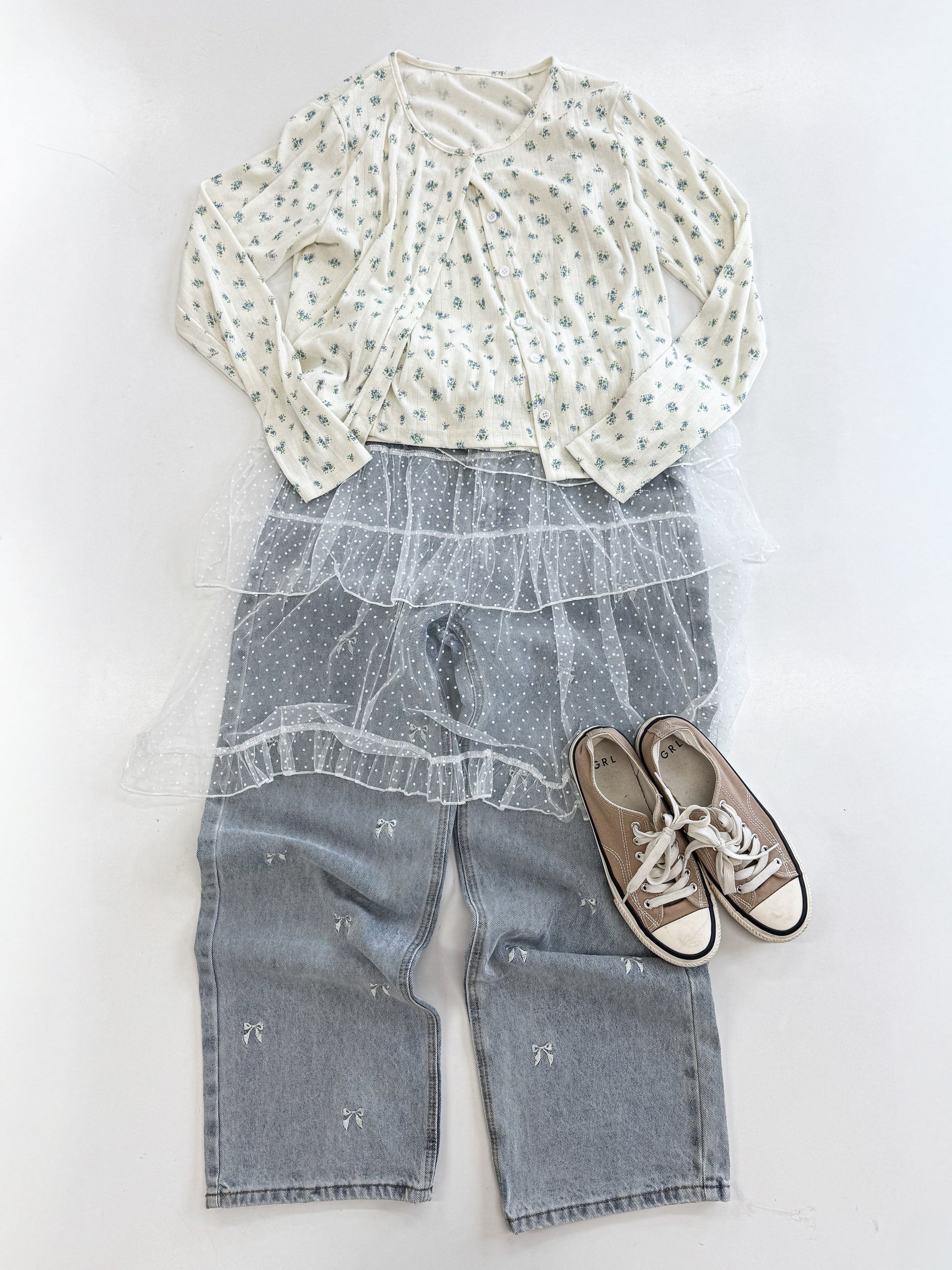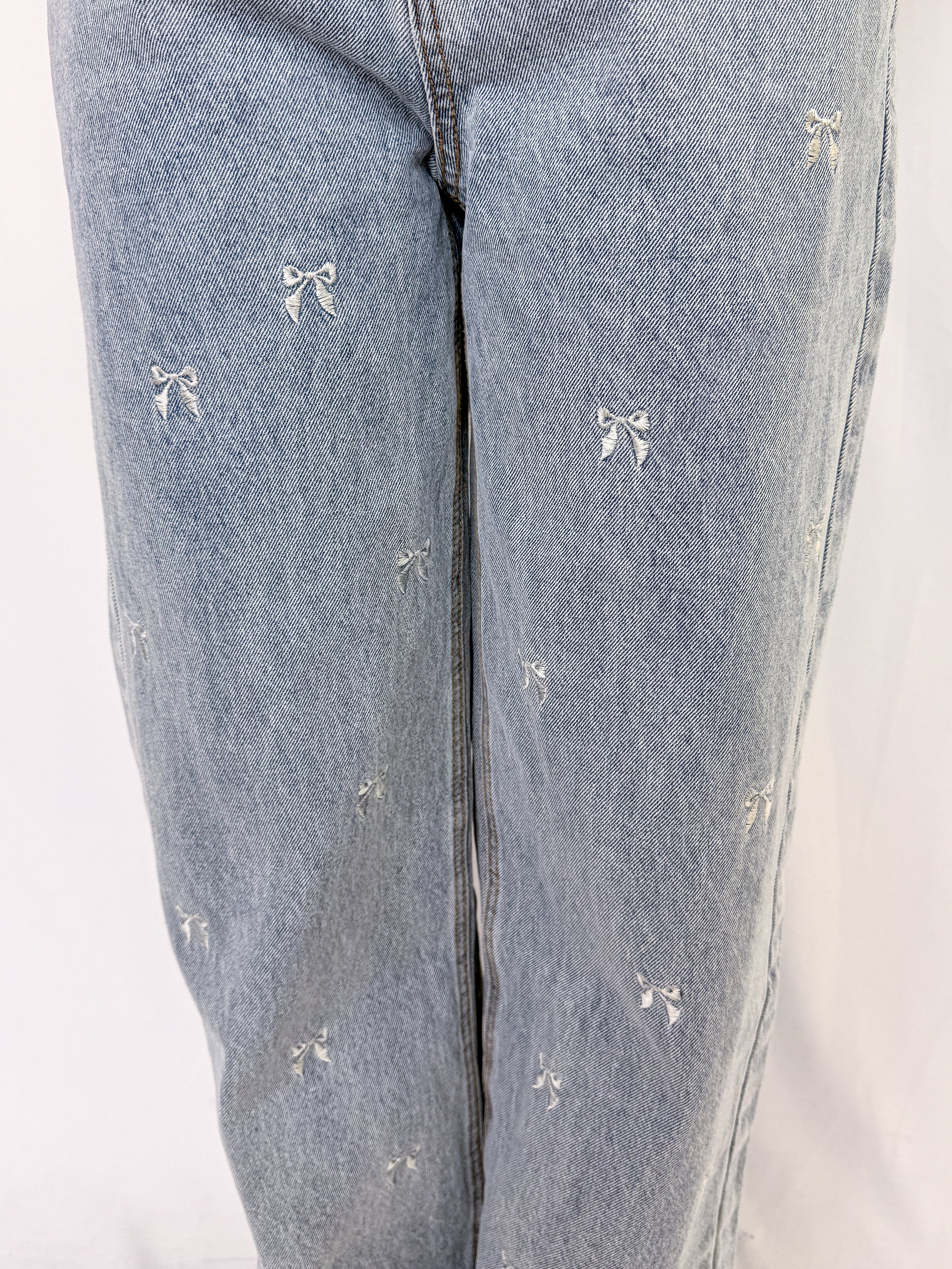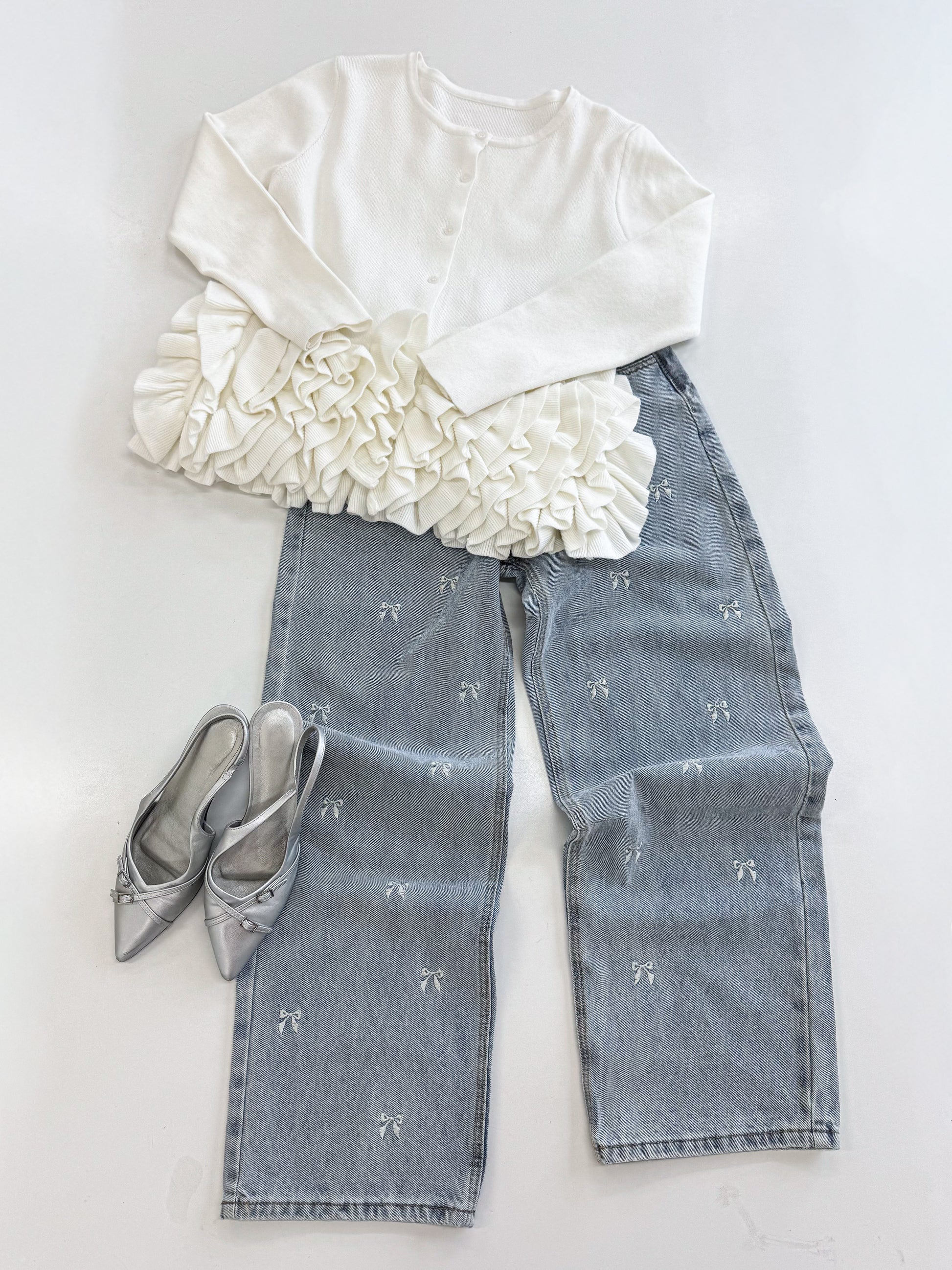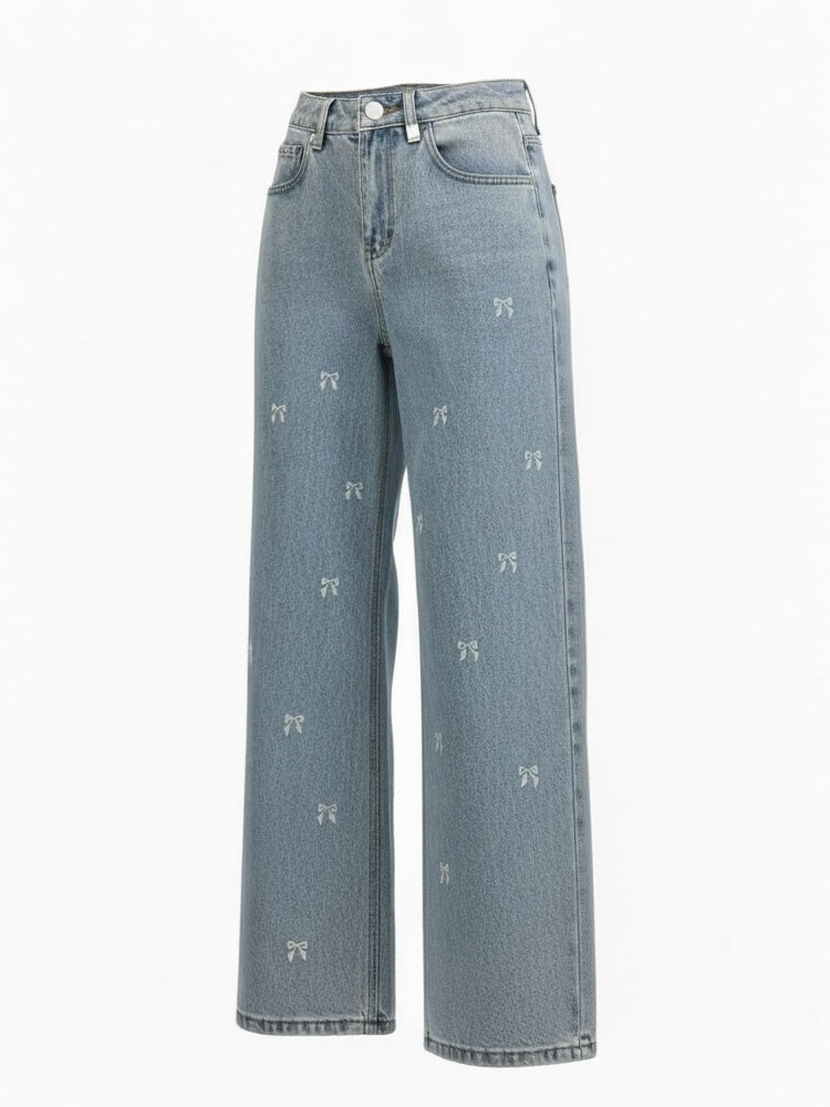 リボンの刺繡が前後に散らばっている可愛い刺繍入りのデニムパンツ。