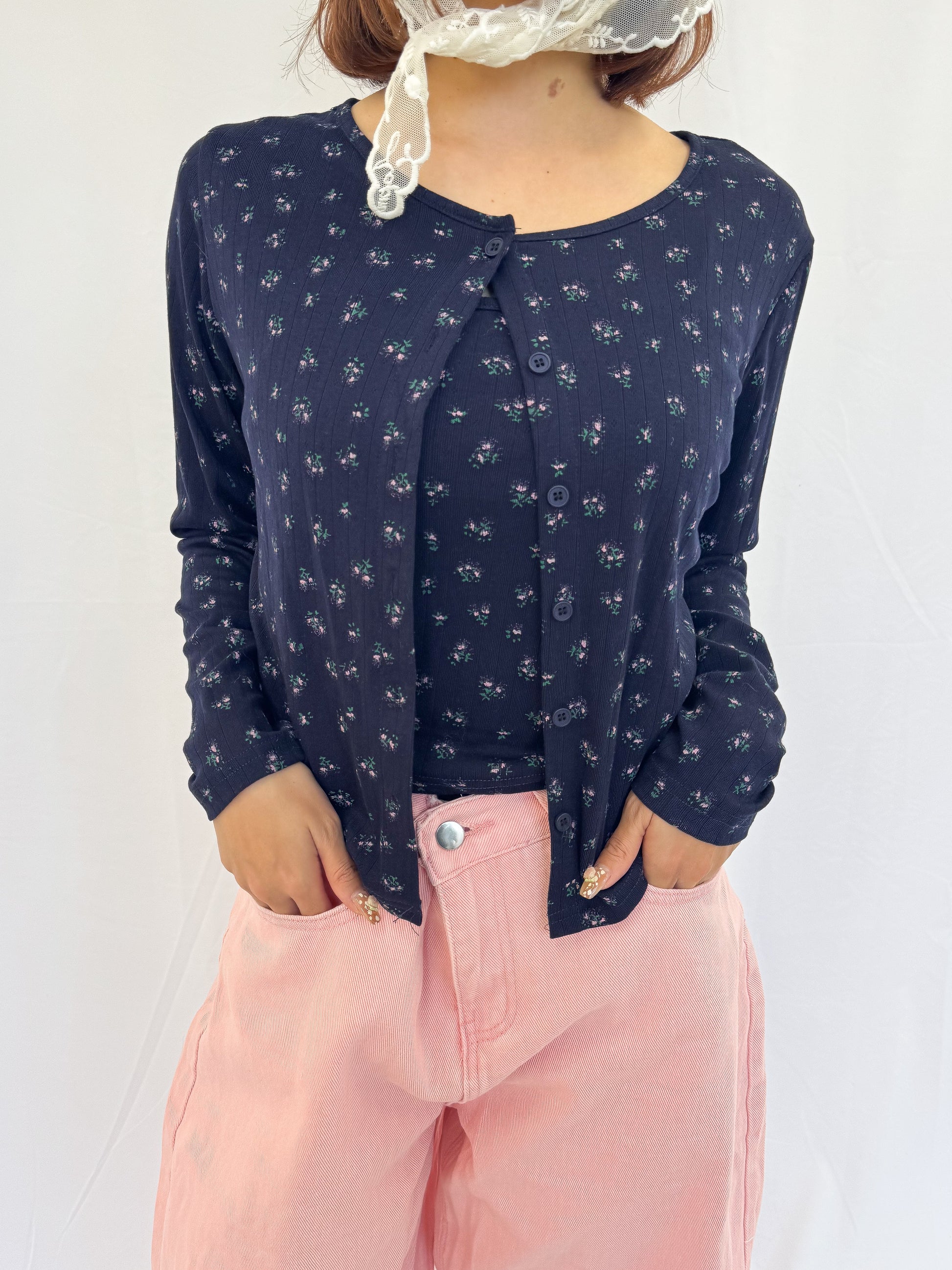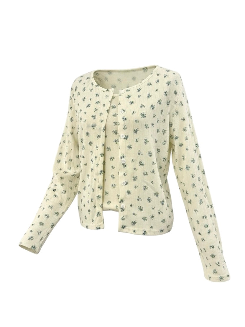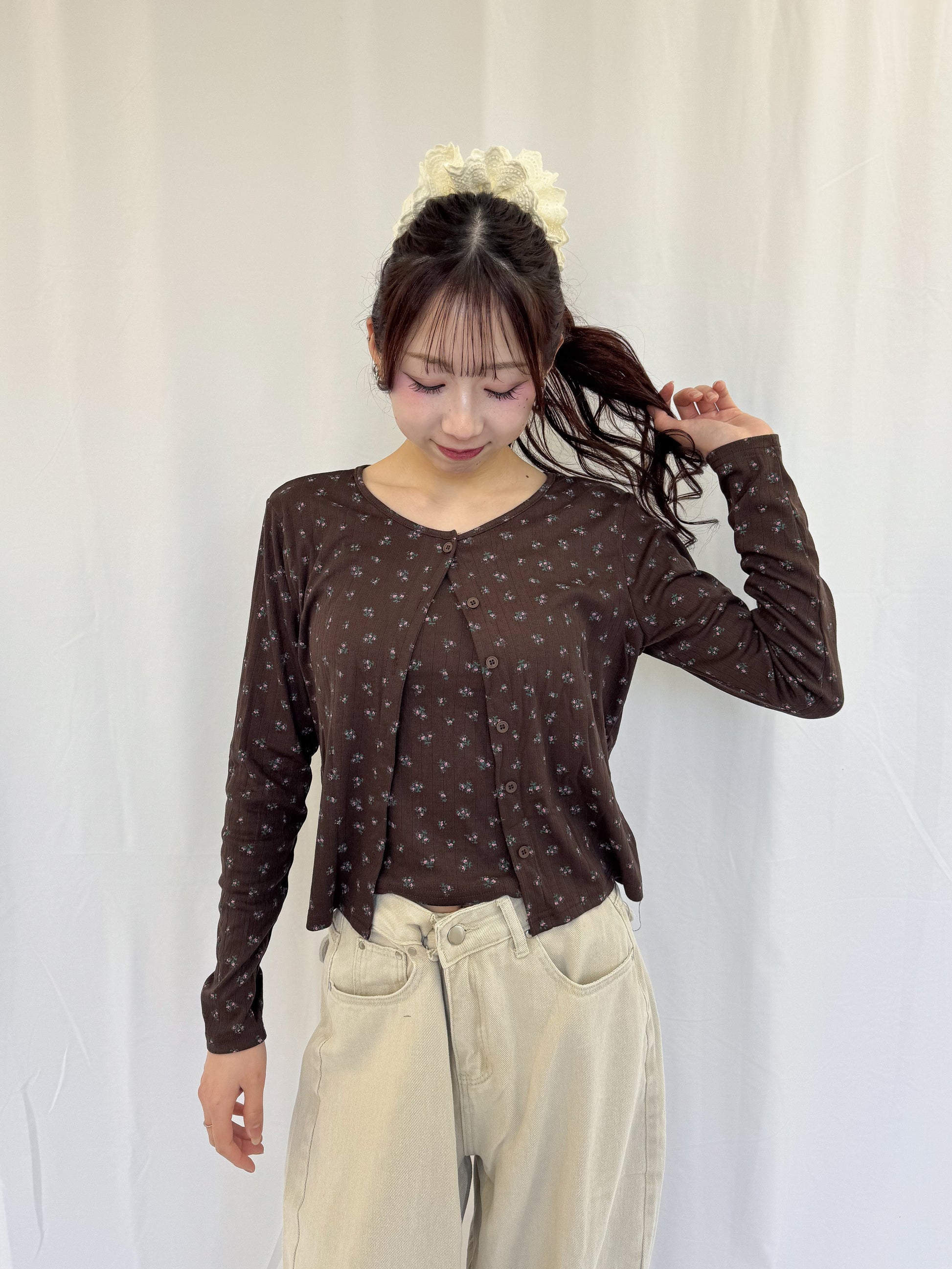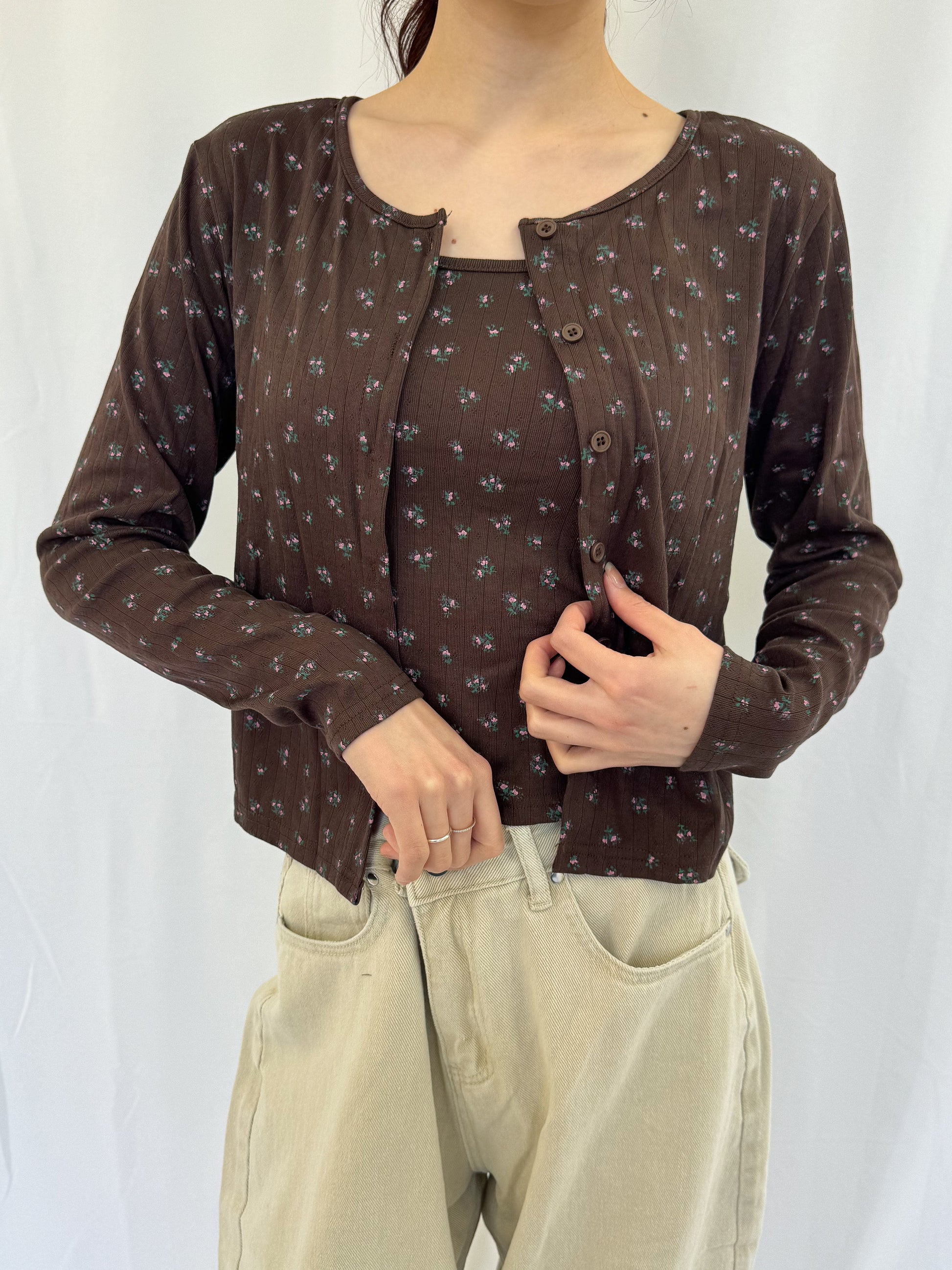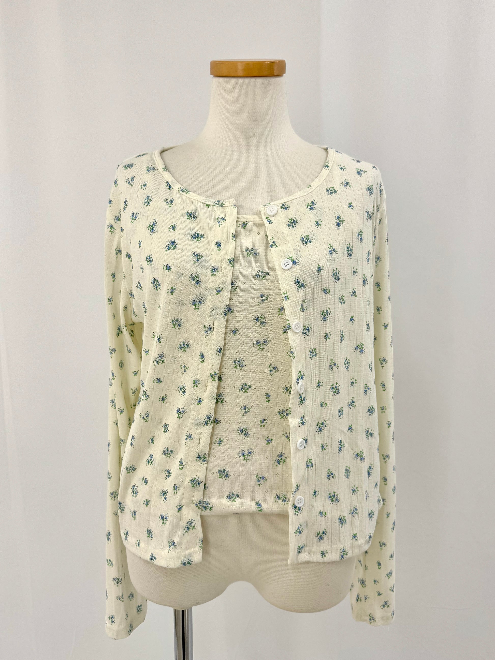 春らしい小花柄のキャミソールとカーディガンのアンサンブル。