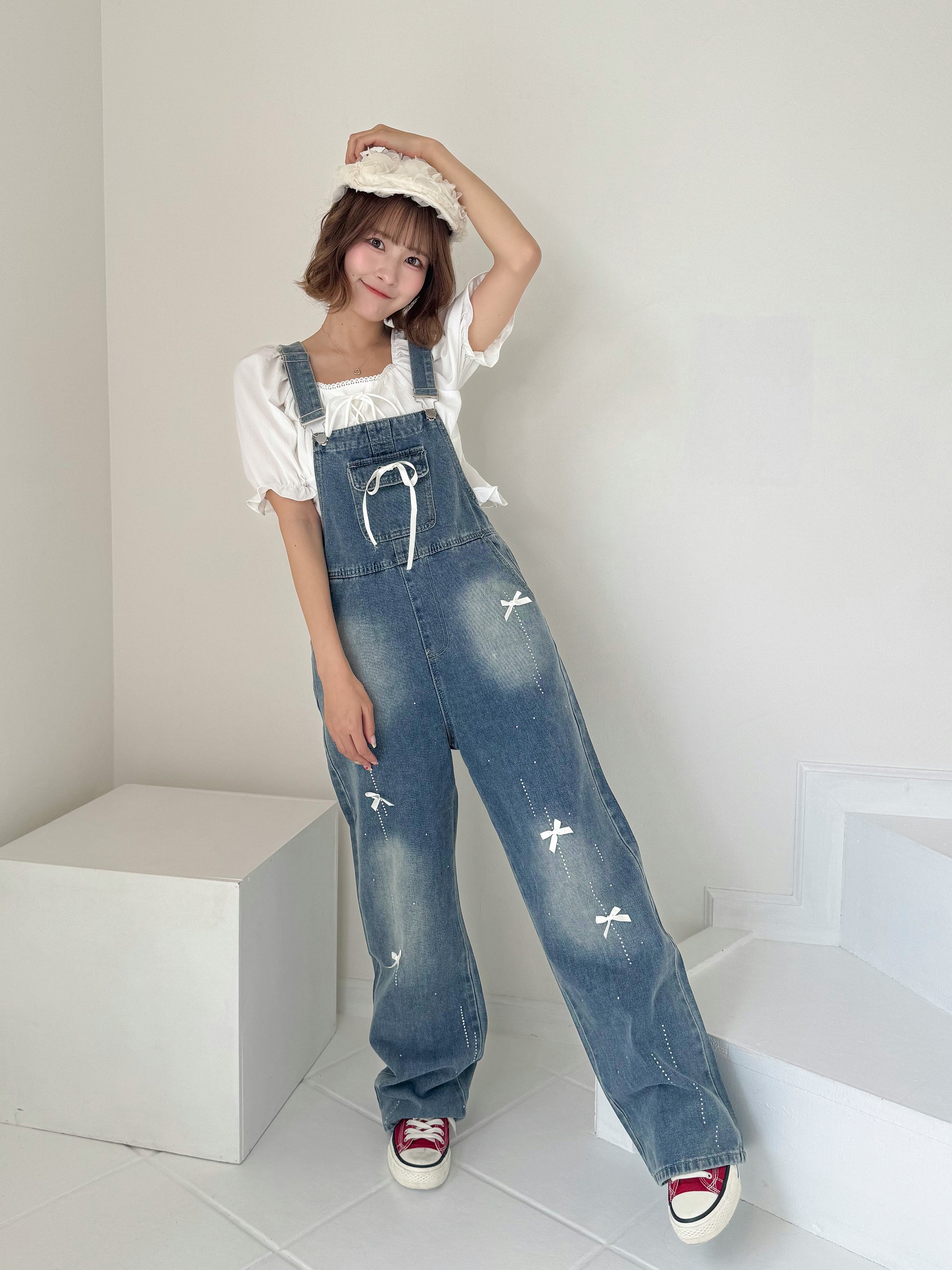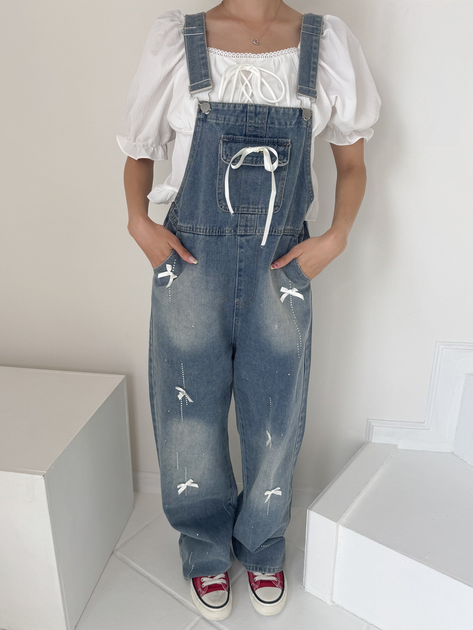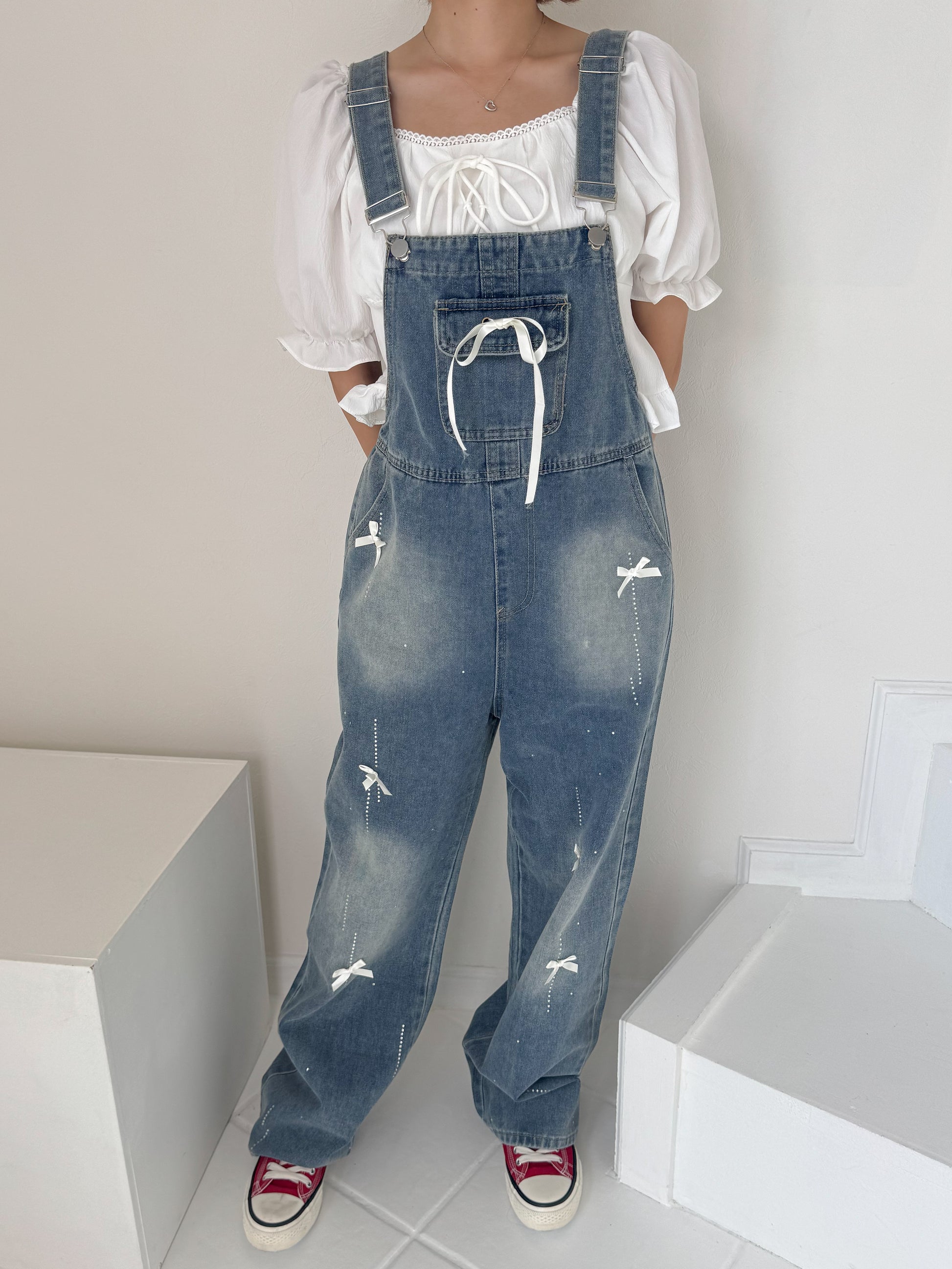 リボンデニムオーバーオール
