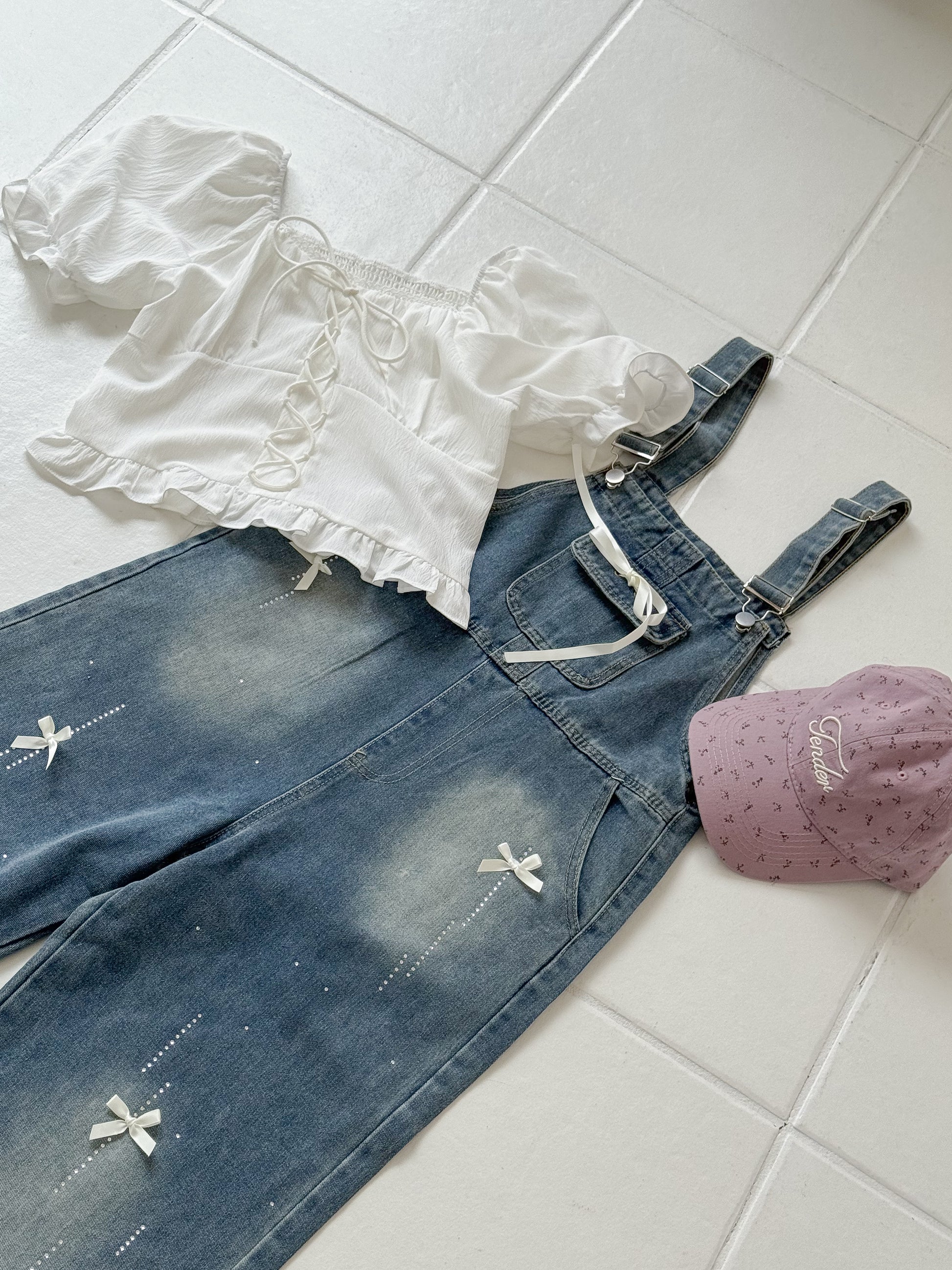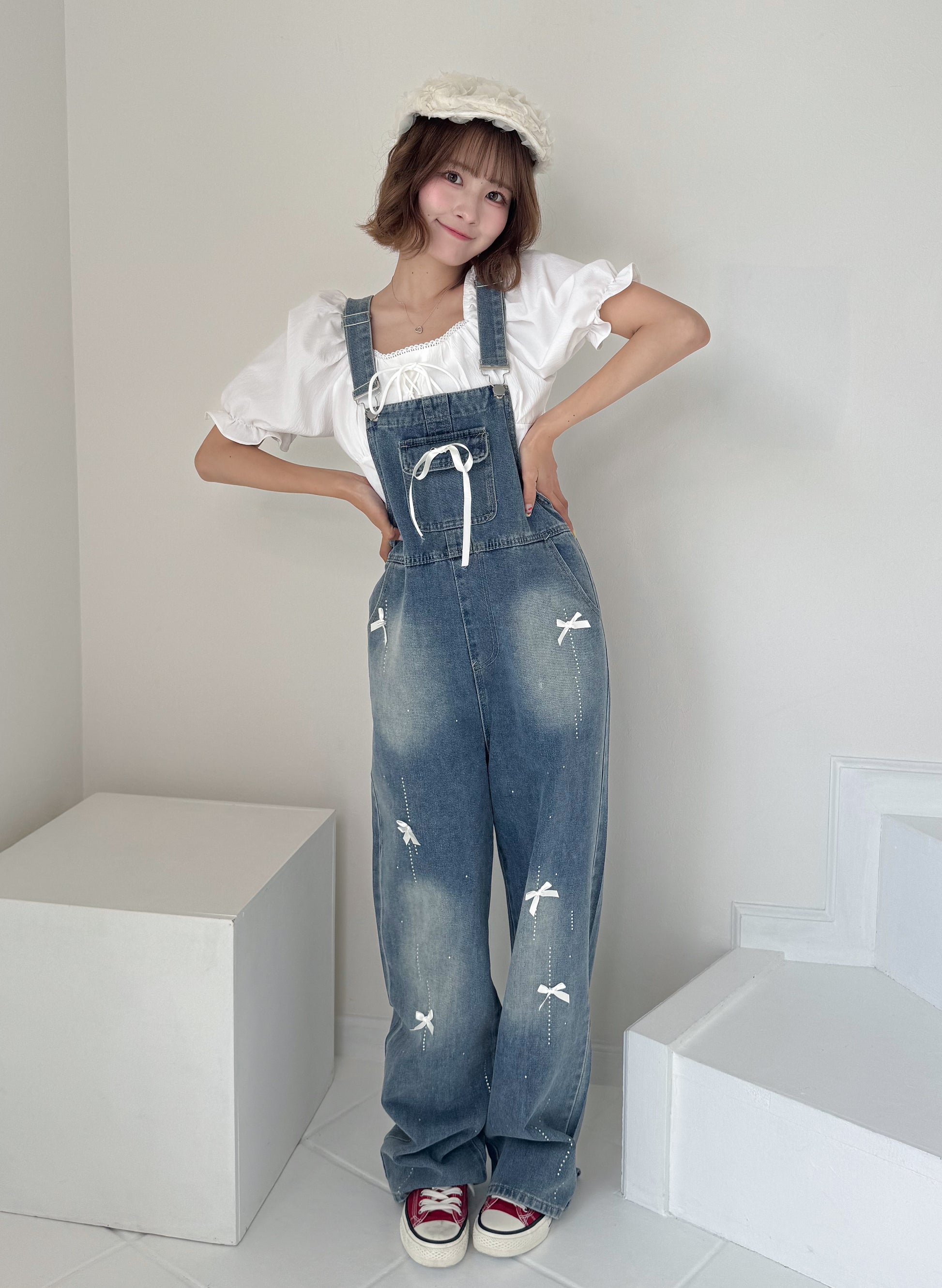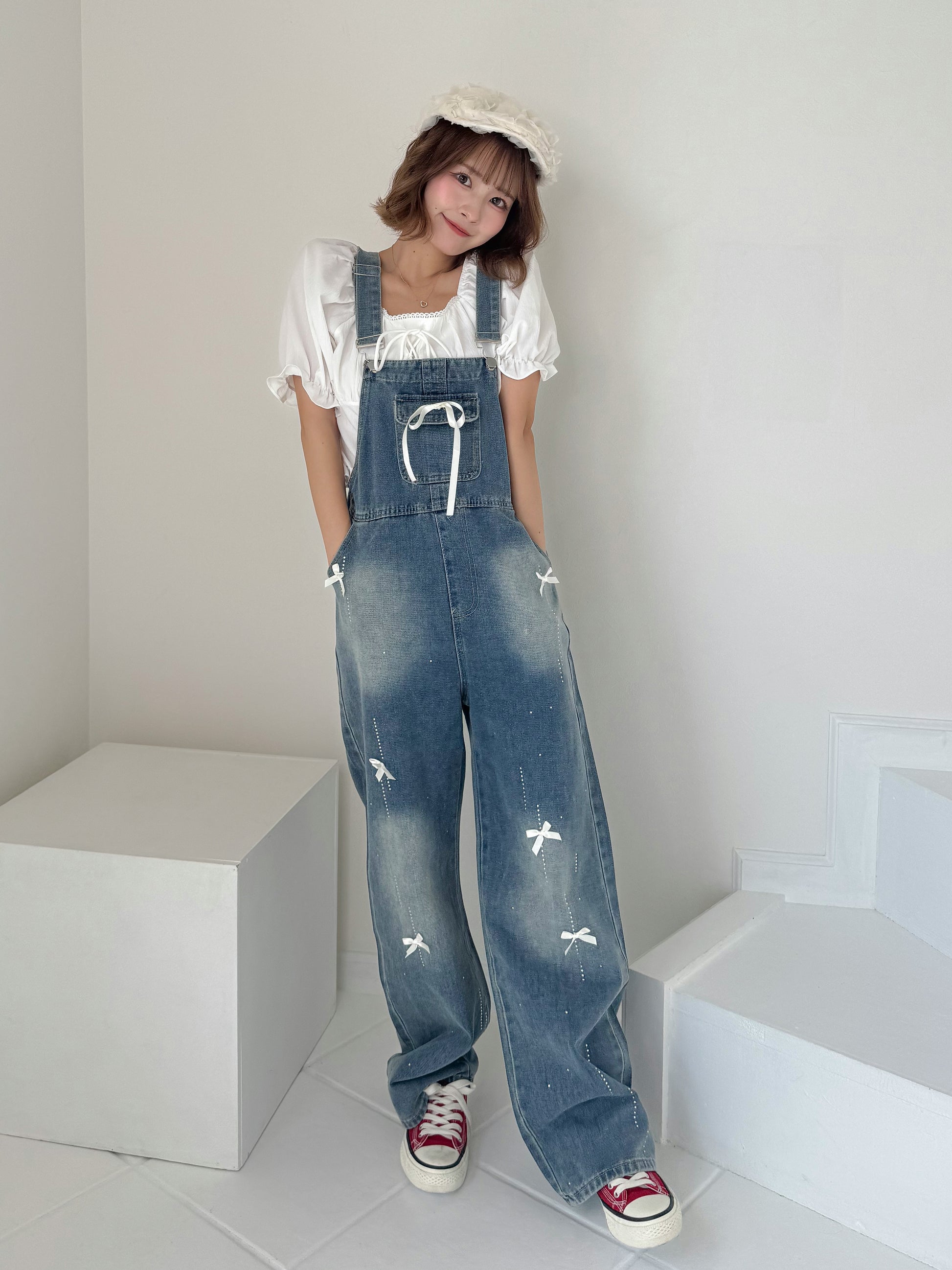 リボンデニムオーバーオール