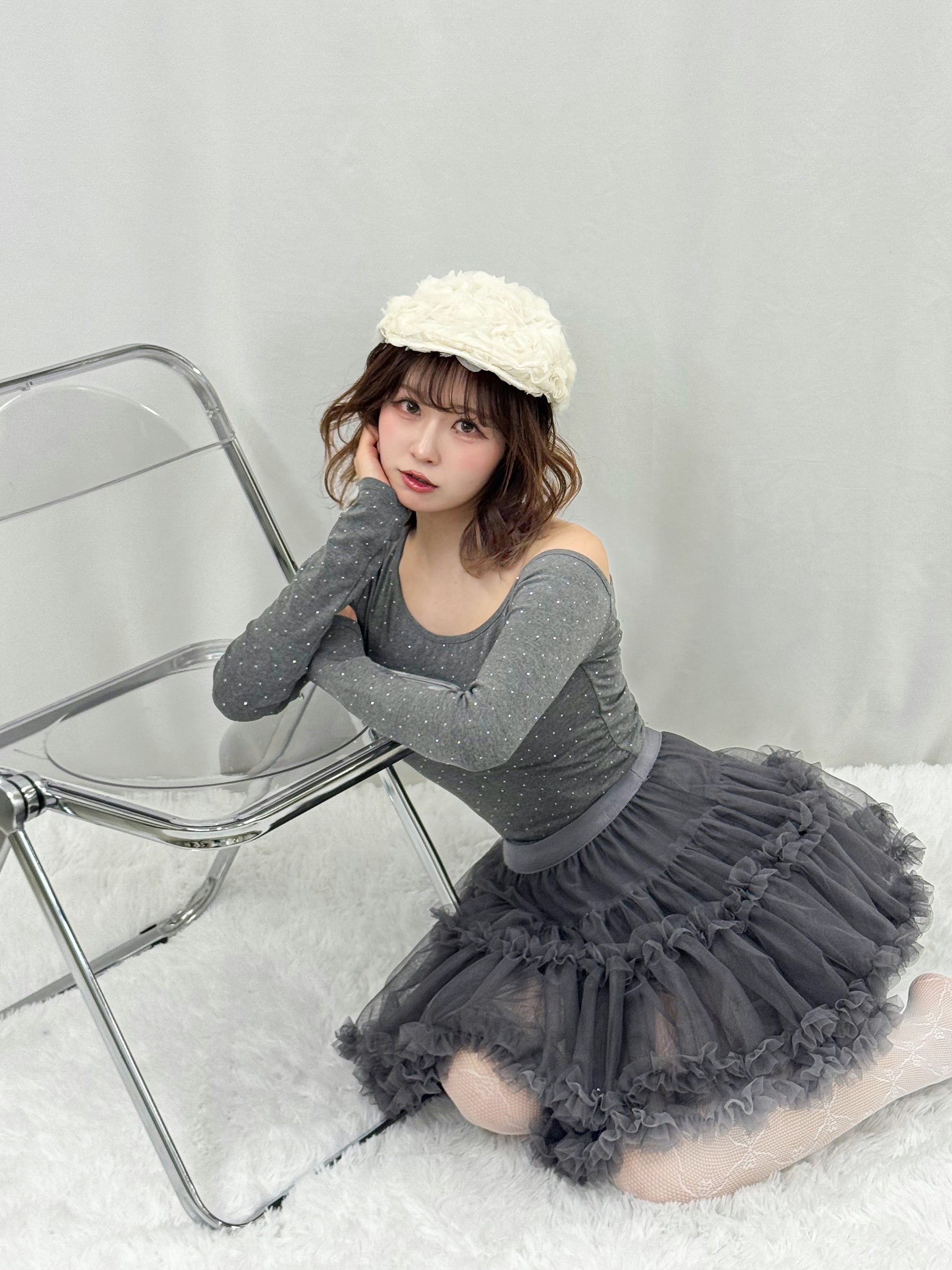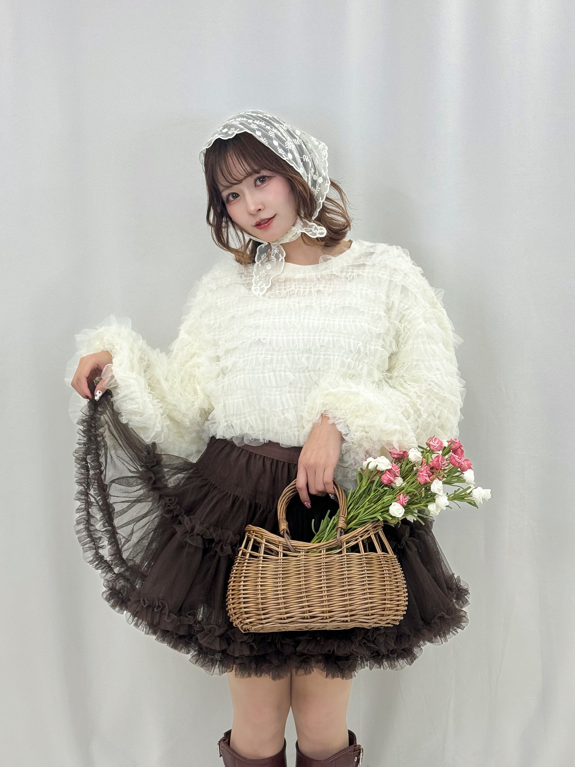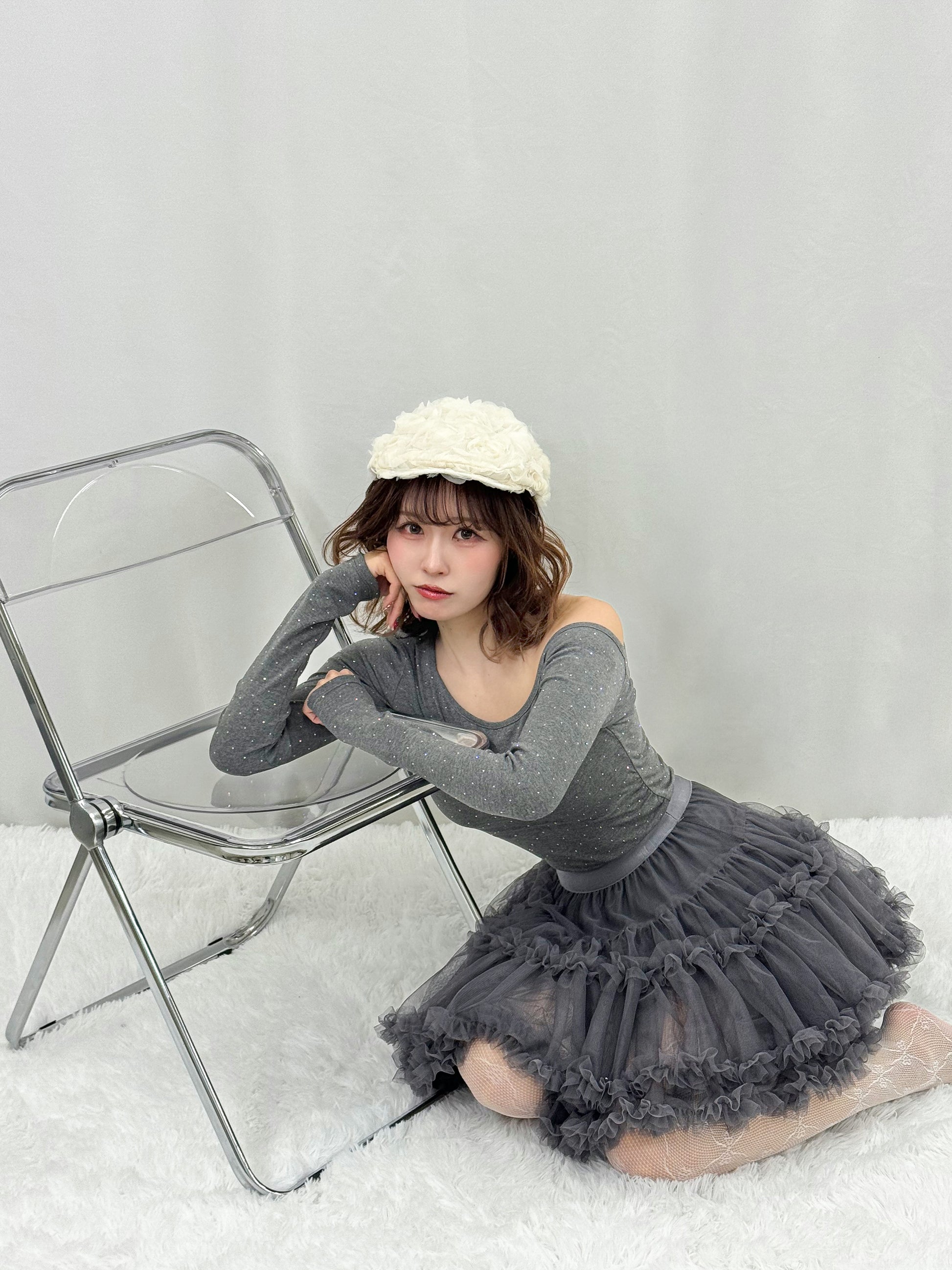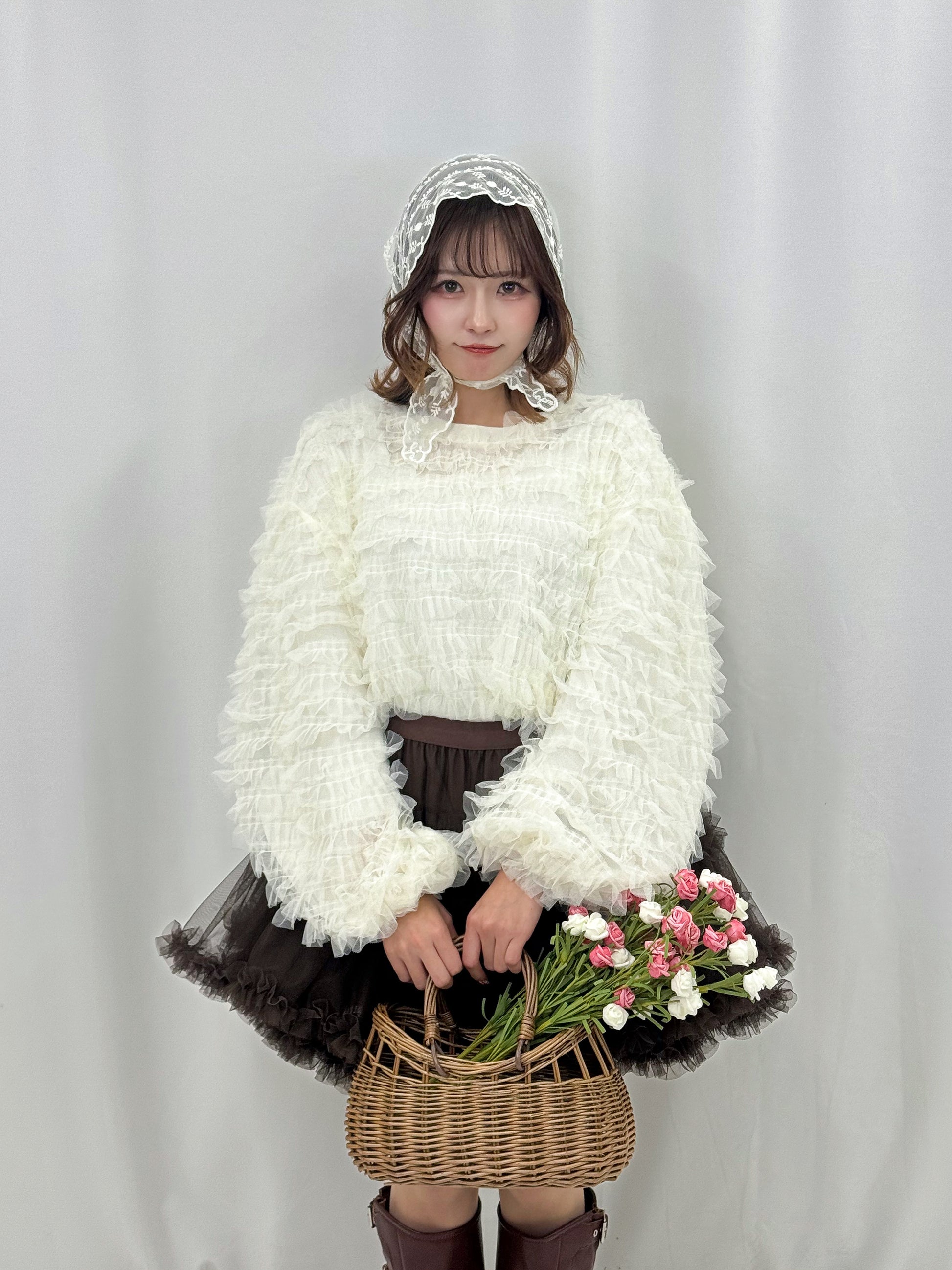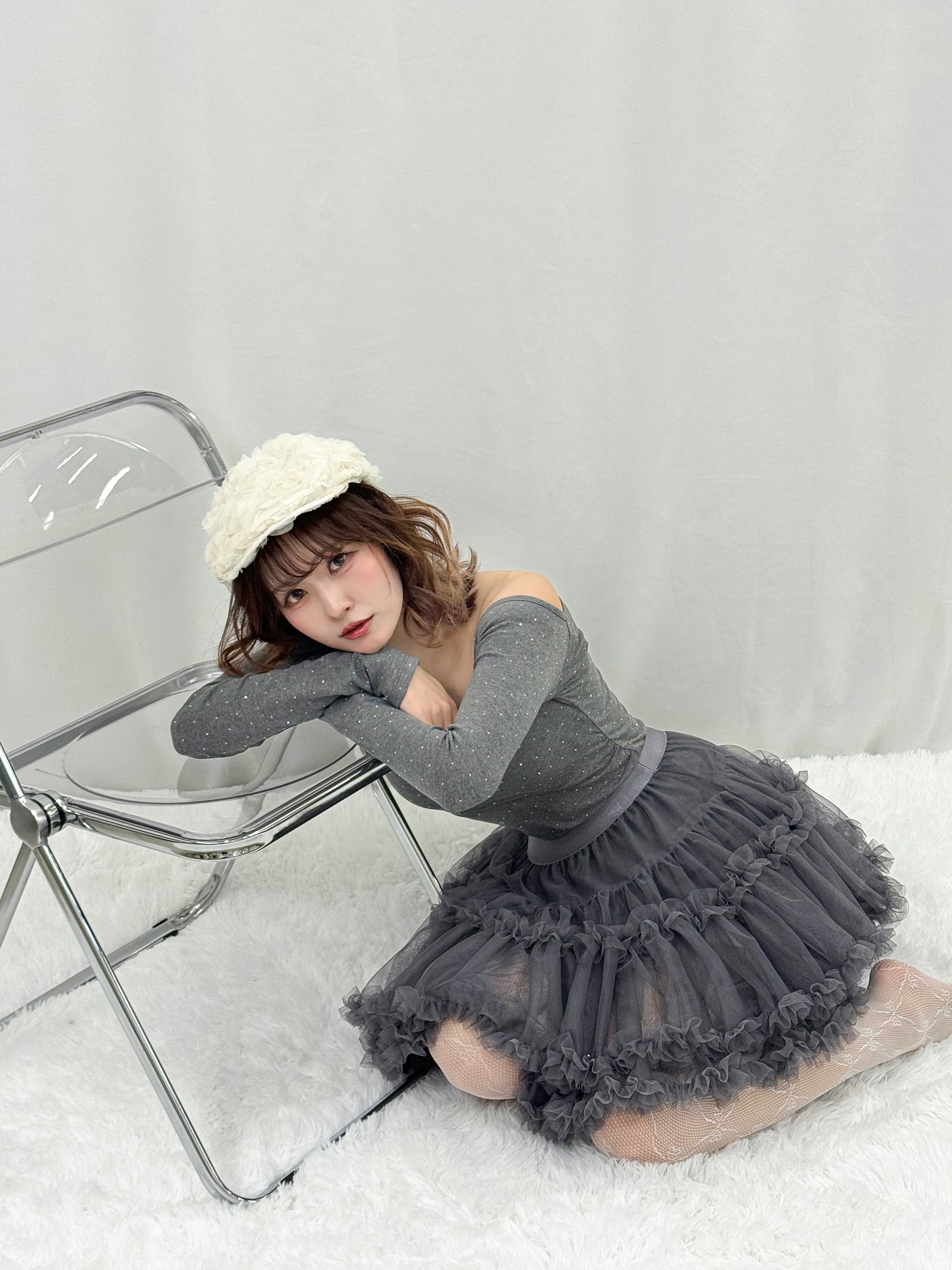 チュールスカートの甘い印象から様々な着こなしが可能に。