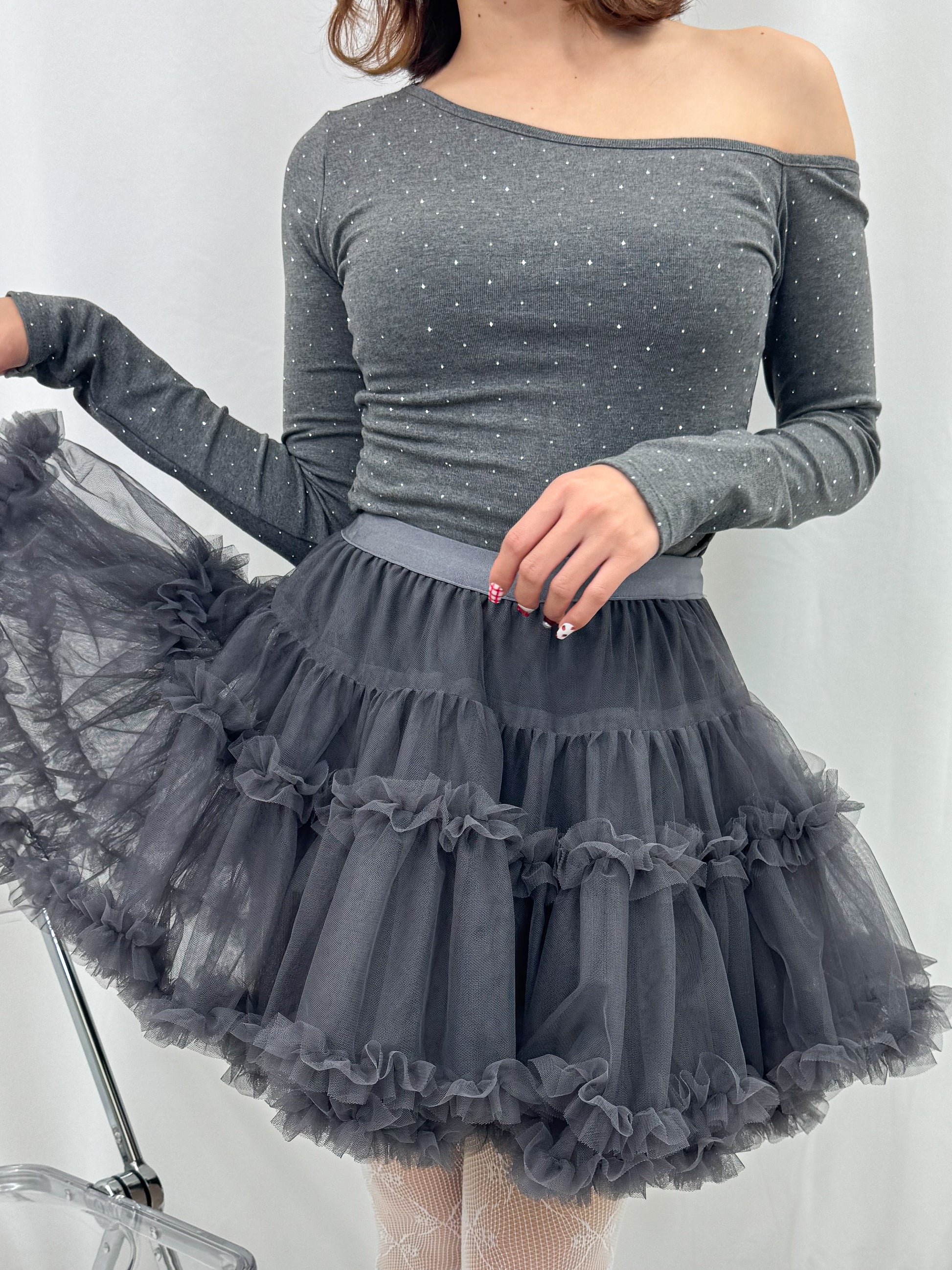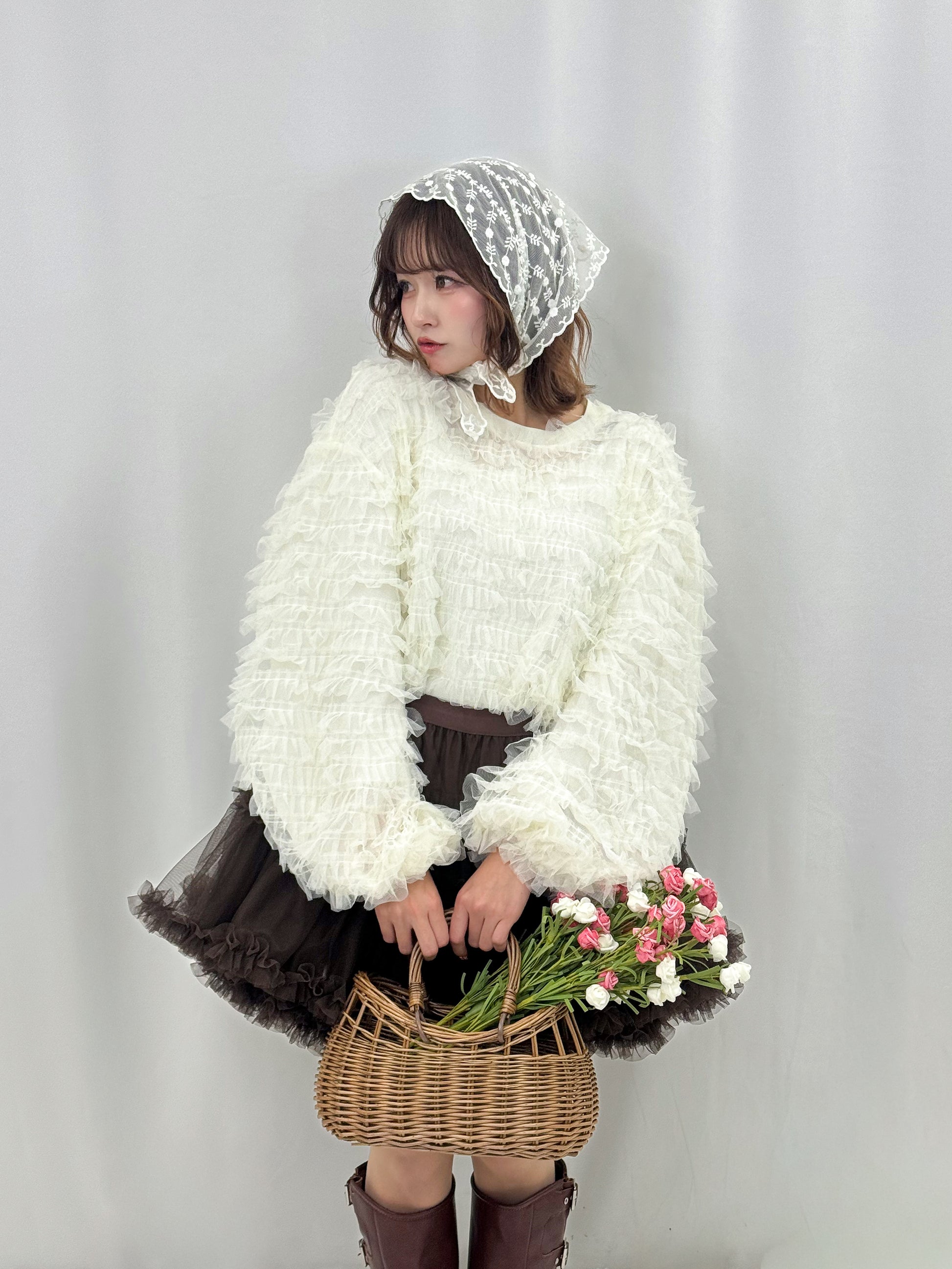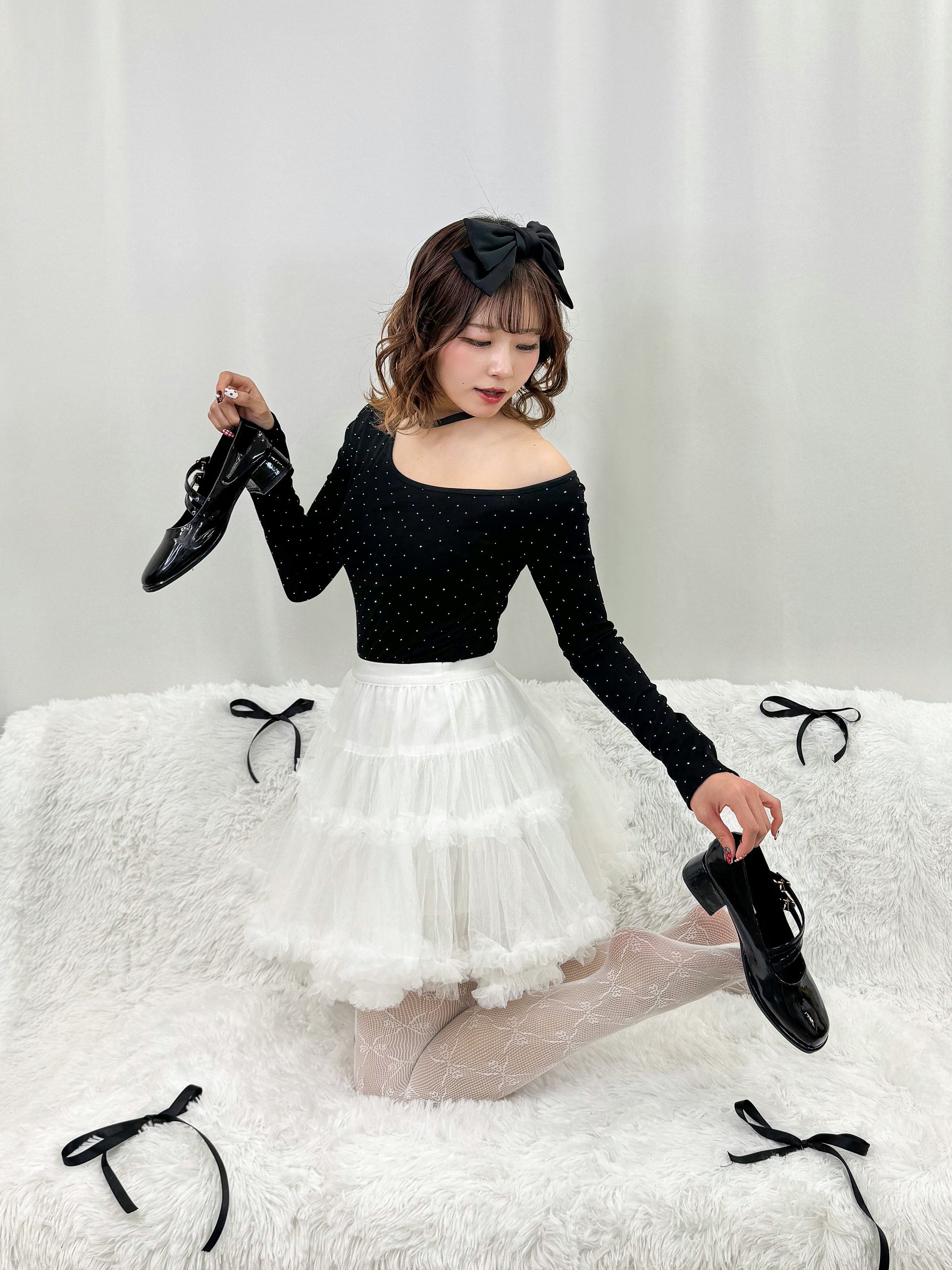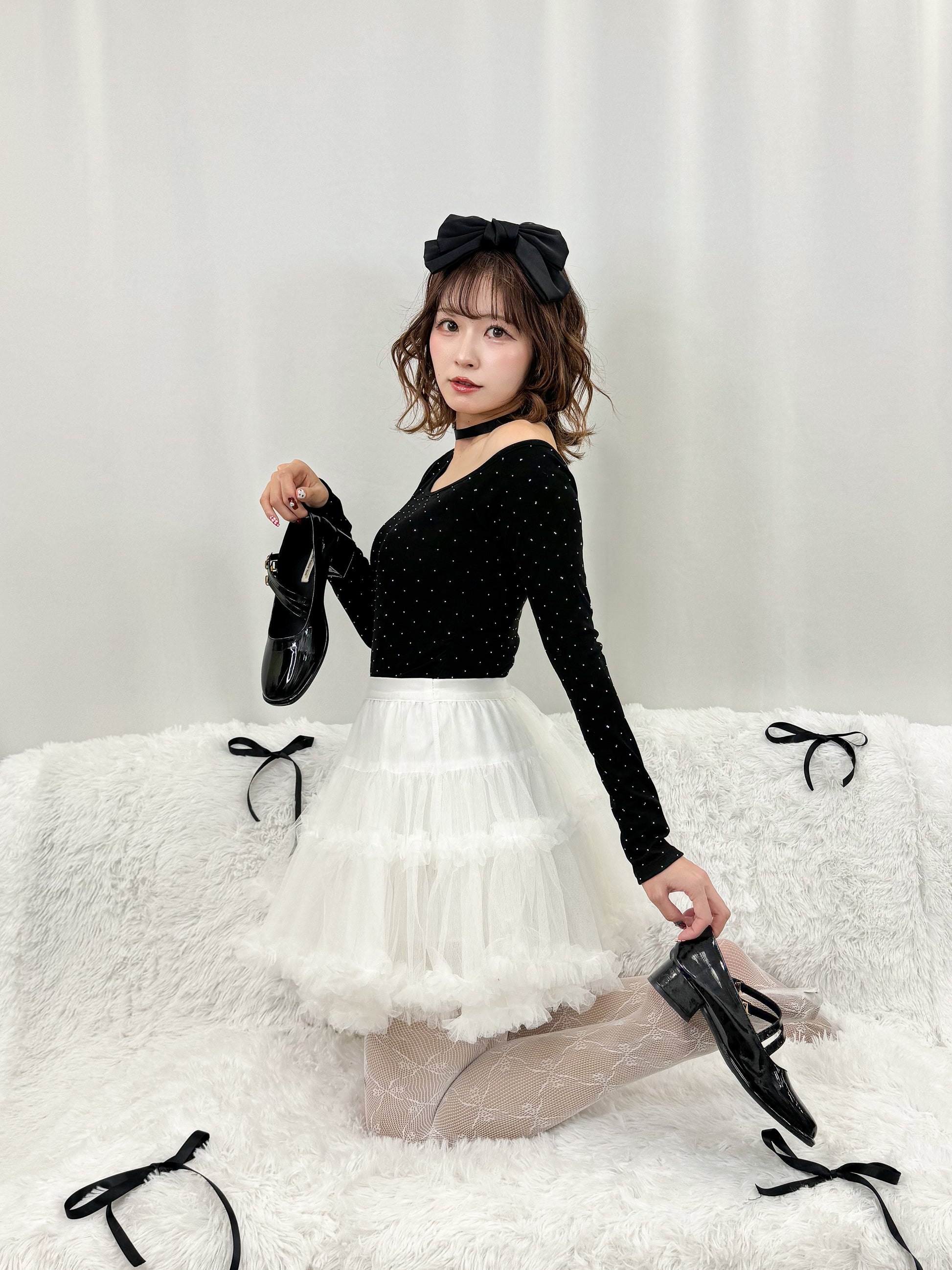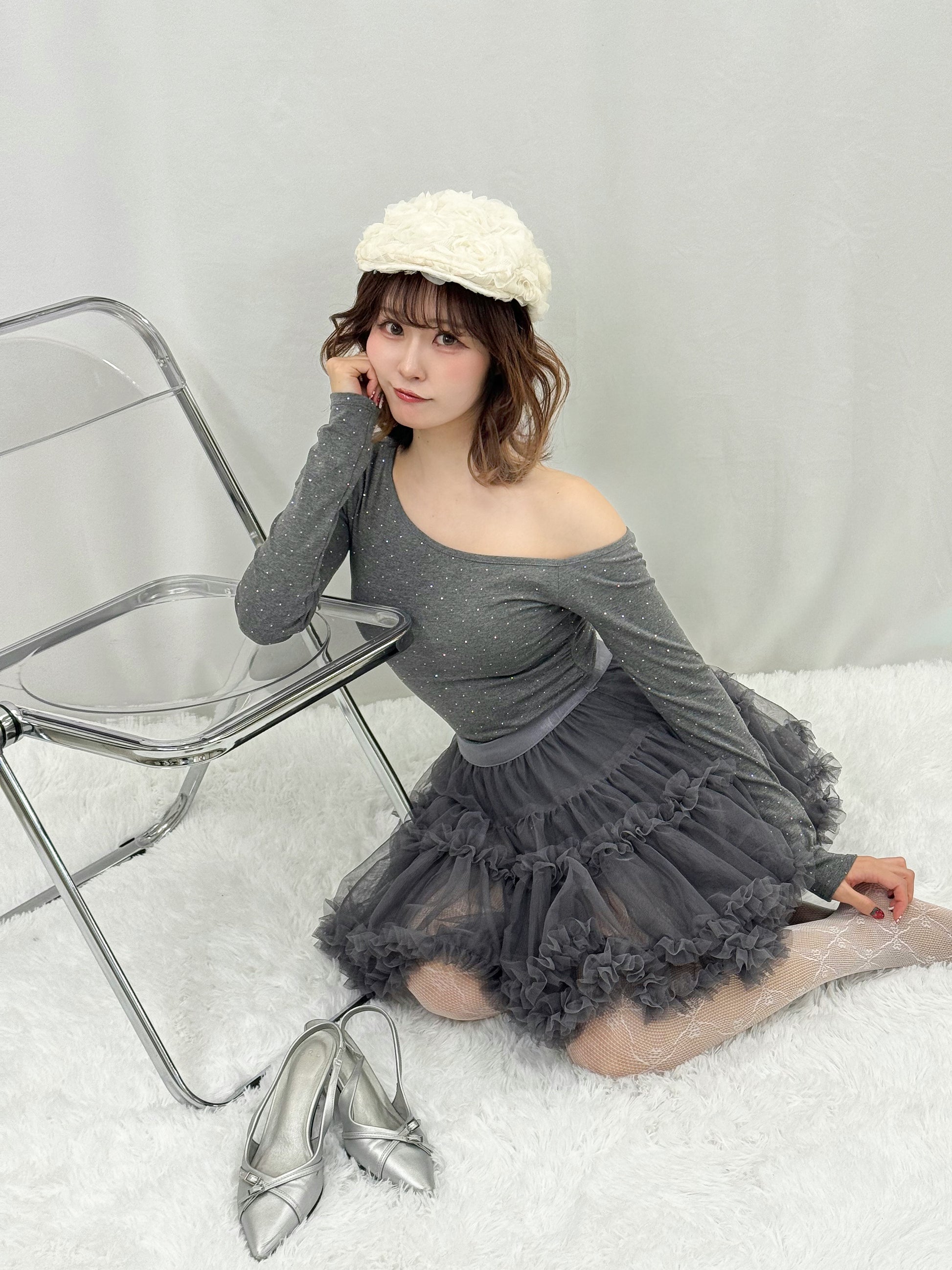 チュールスカートの甘い印象から様々な着こなしが可能に。