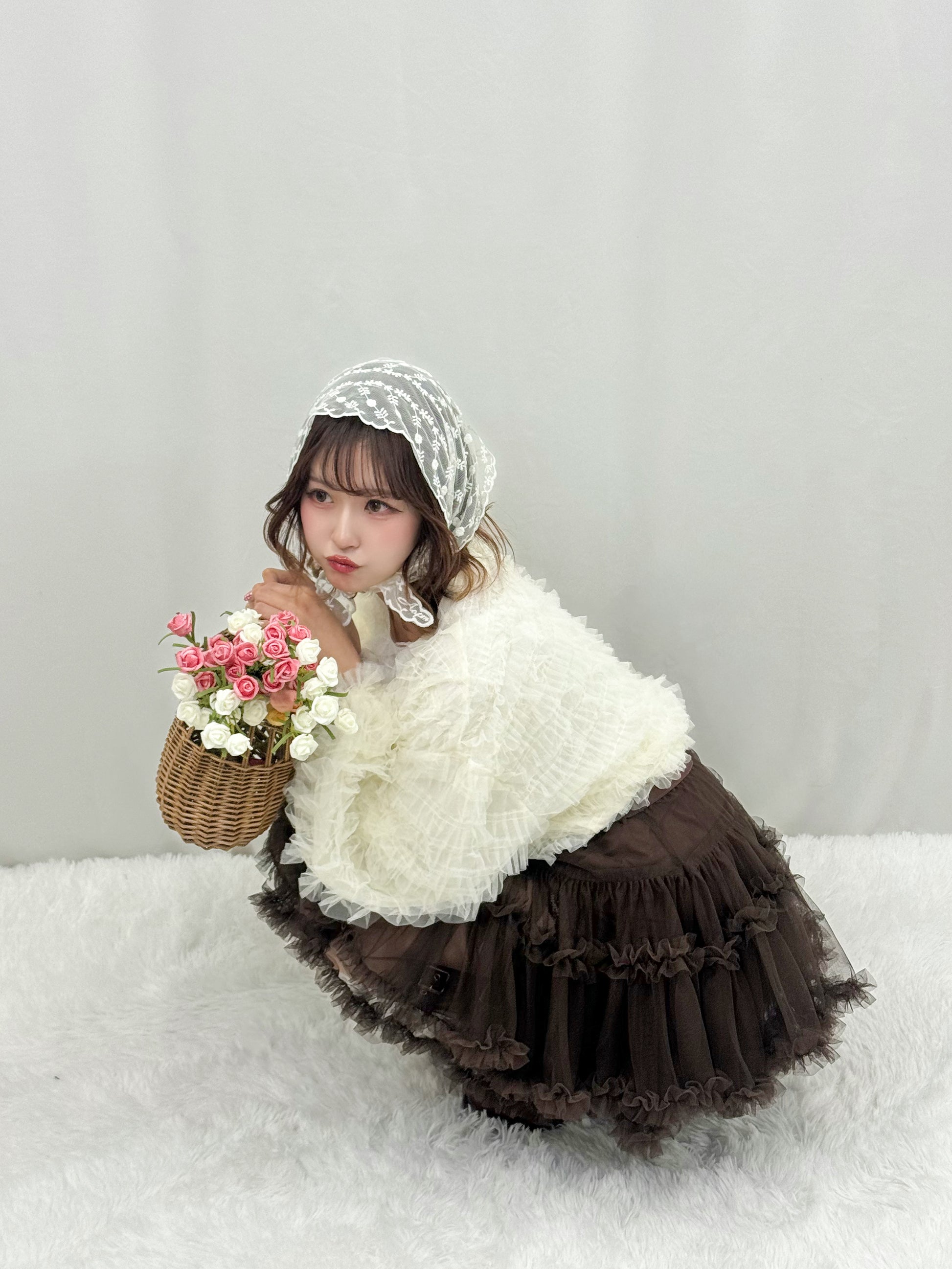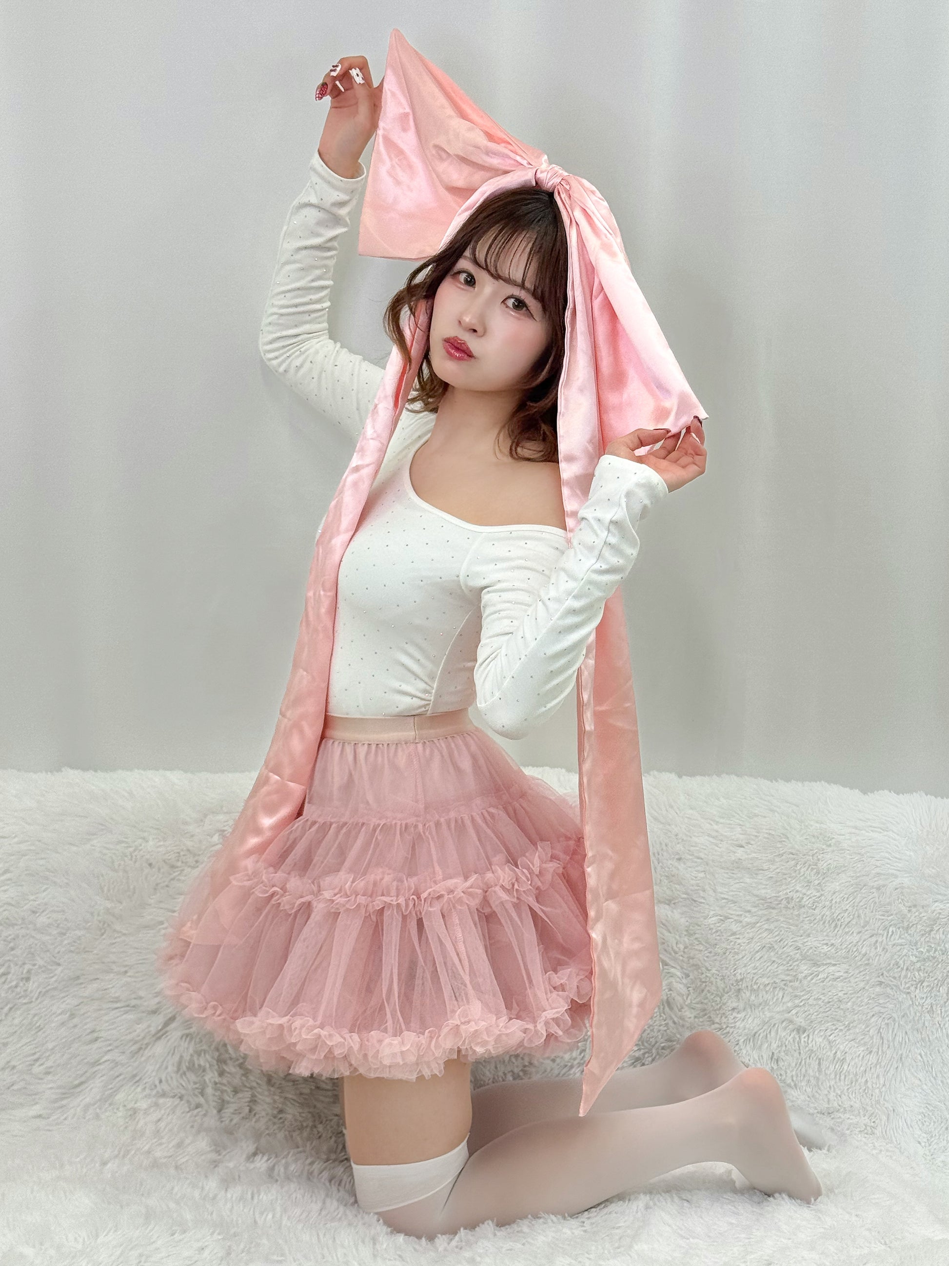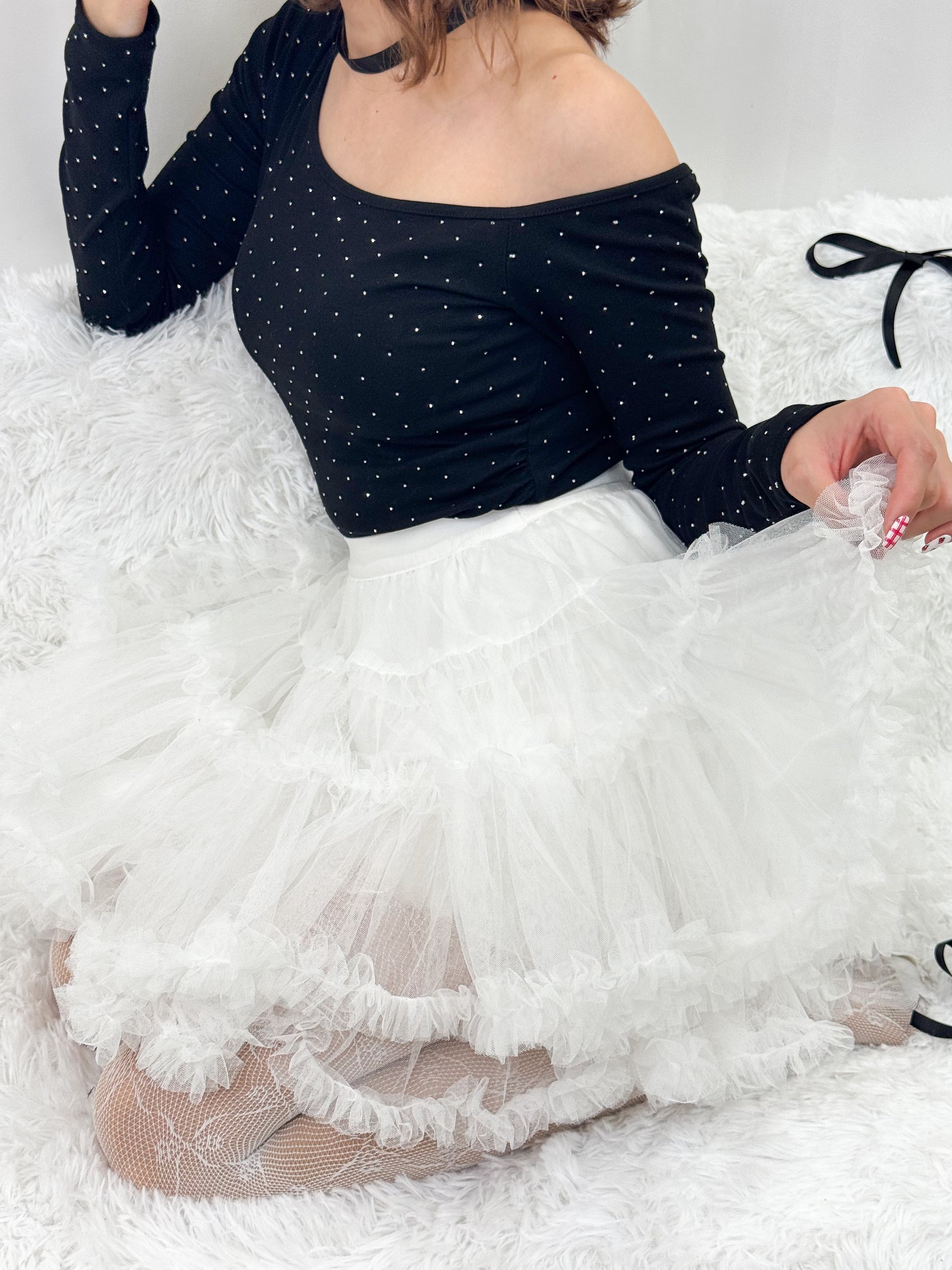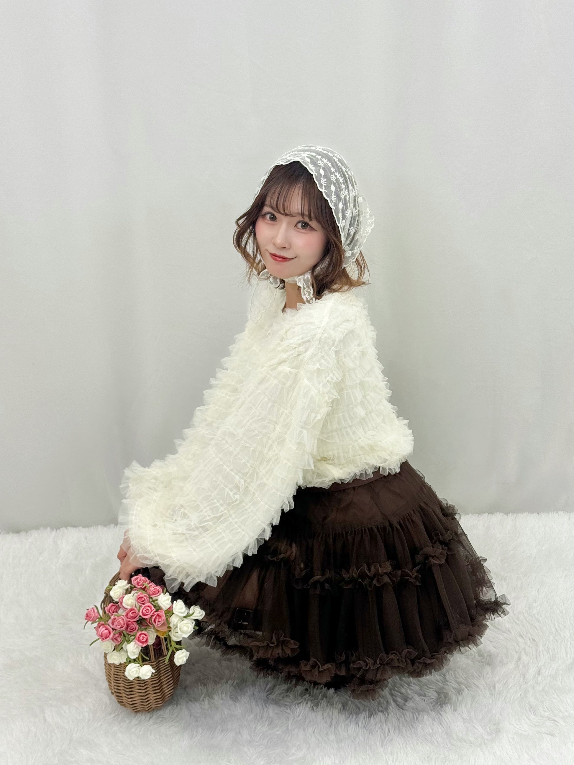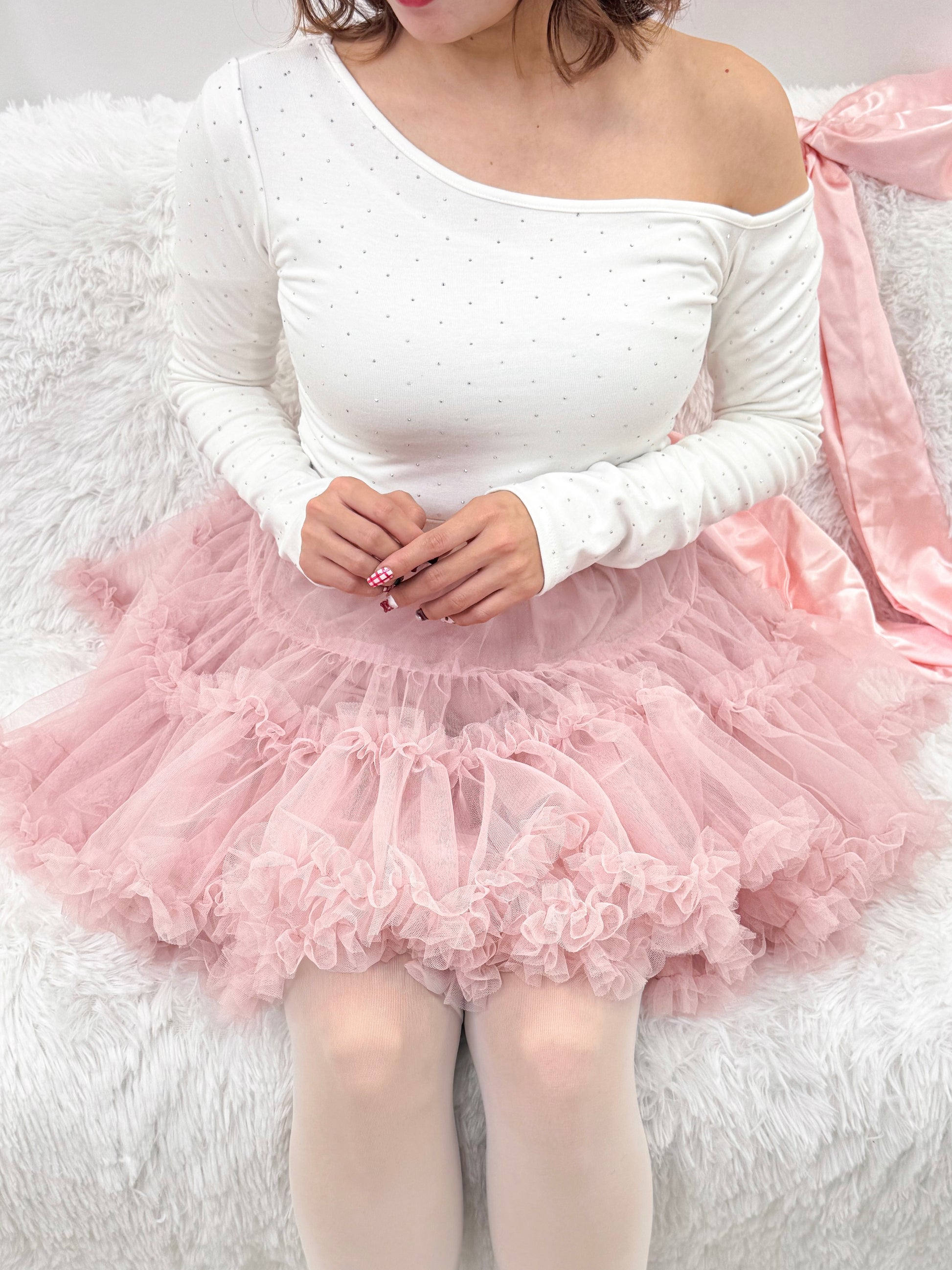 チュールスカートの甘い印象から様々な着こなしが可能に。