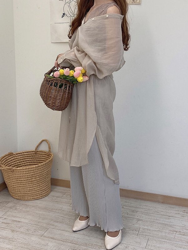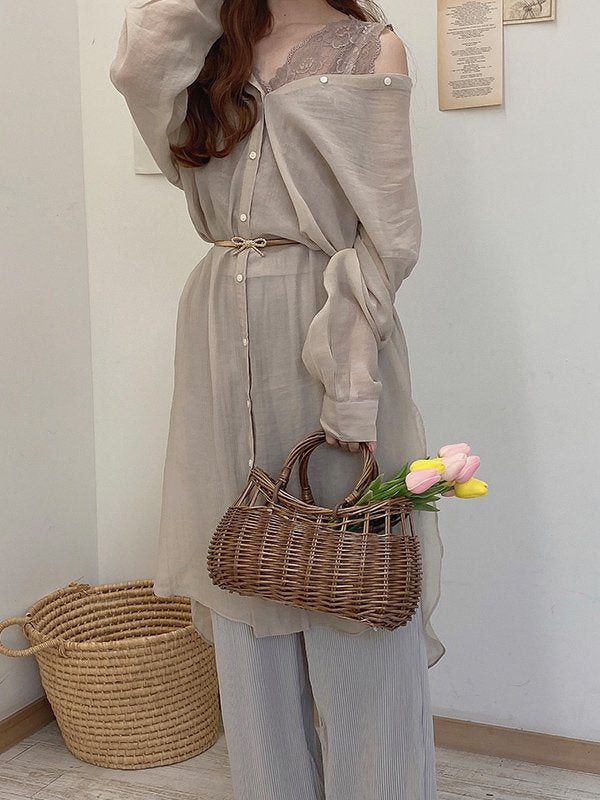 レーシーノーカラーロングシャツワンピ