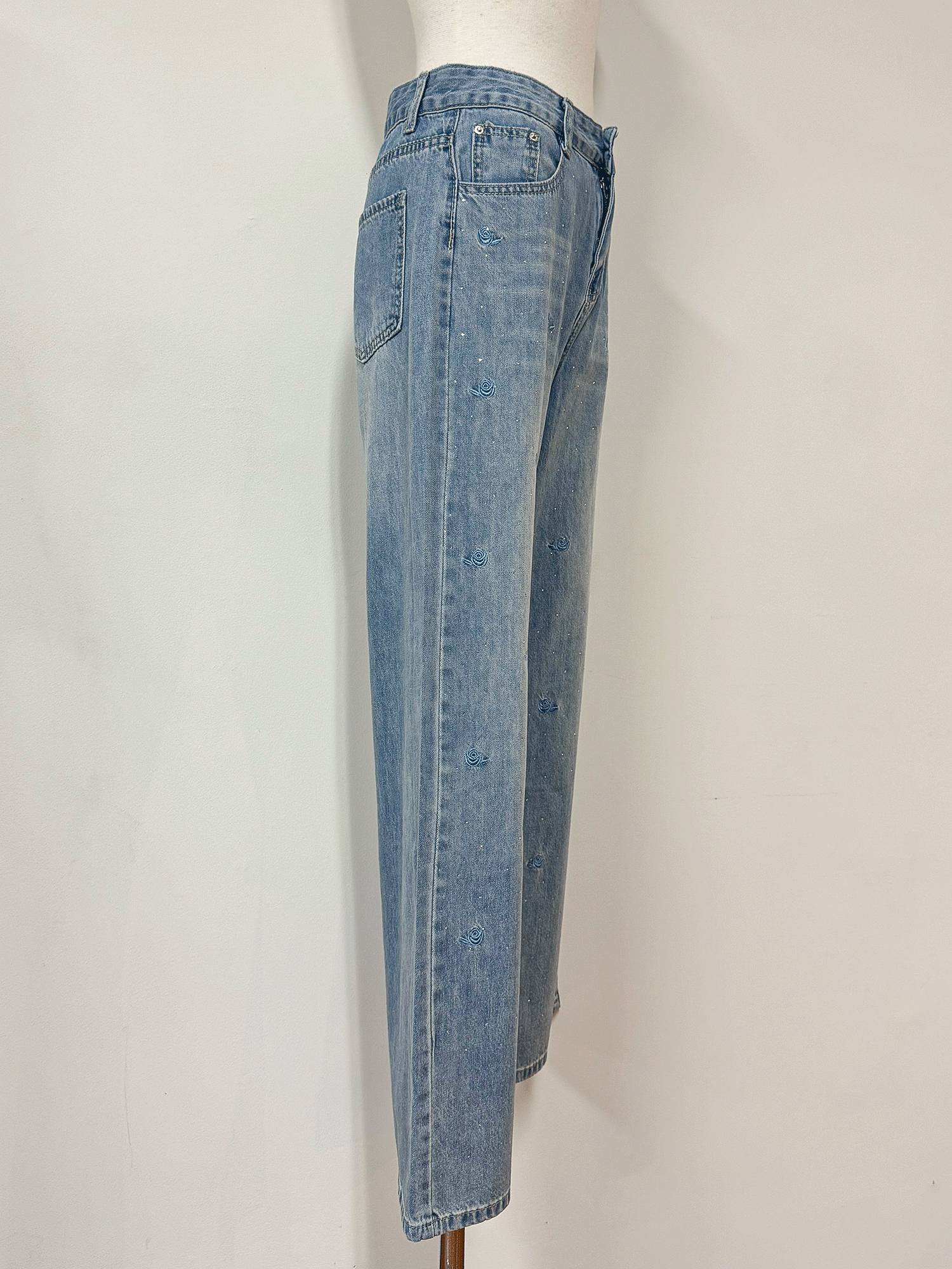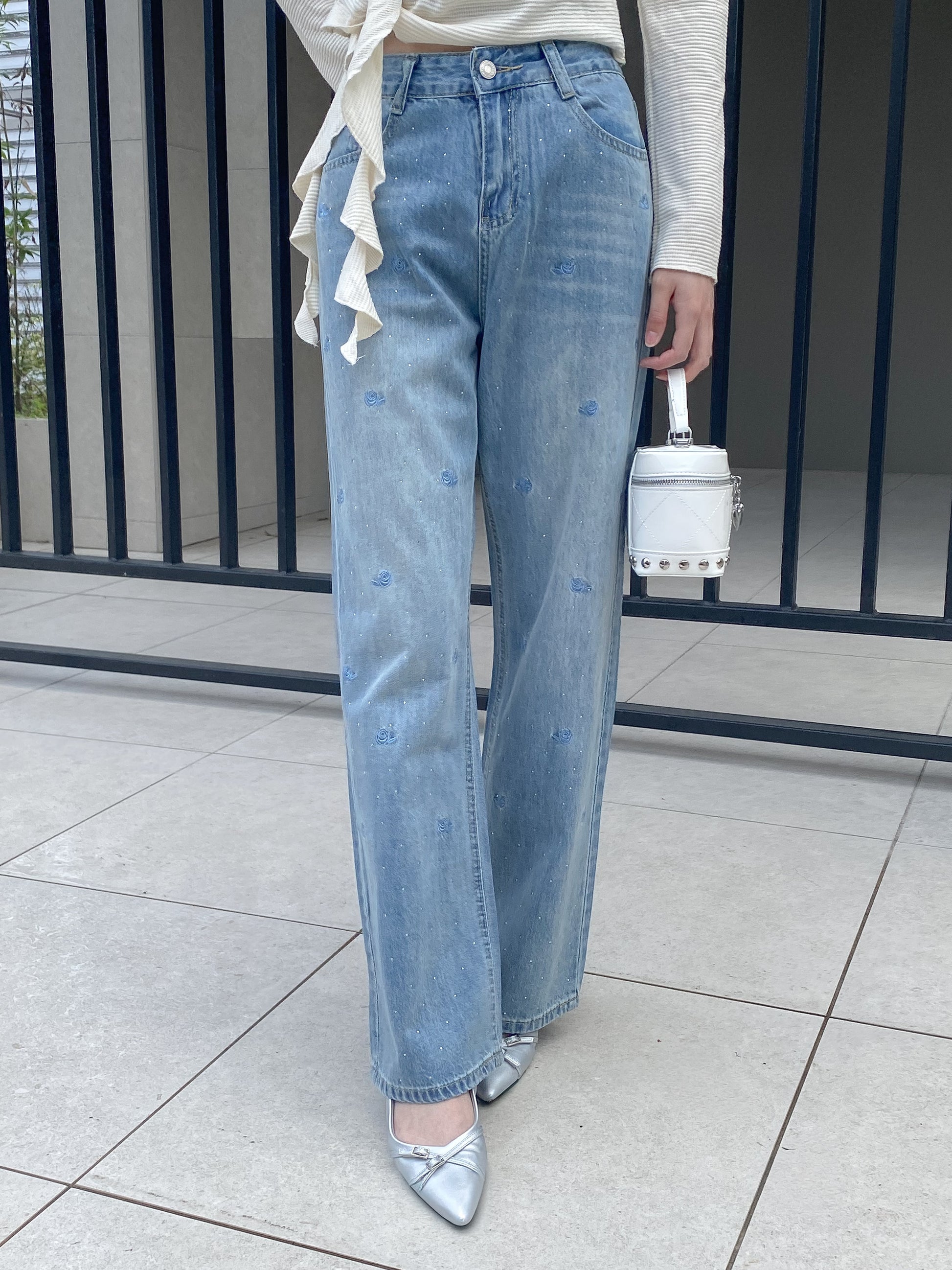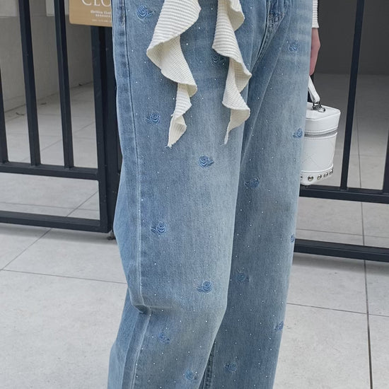 【Official限定価格】ビジュー付きローズ刺繡デニムパンツ