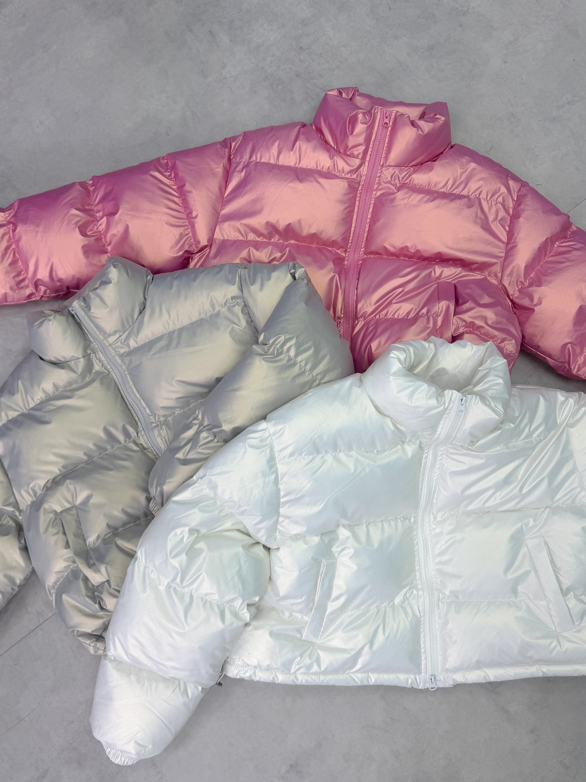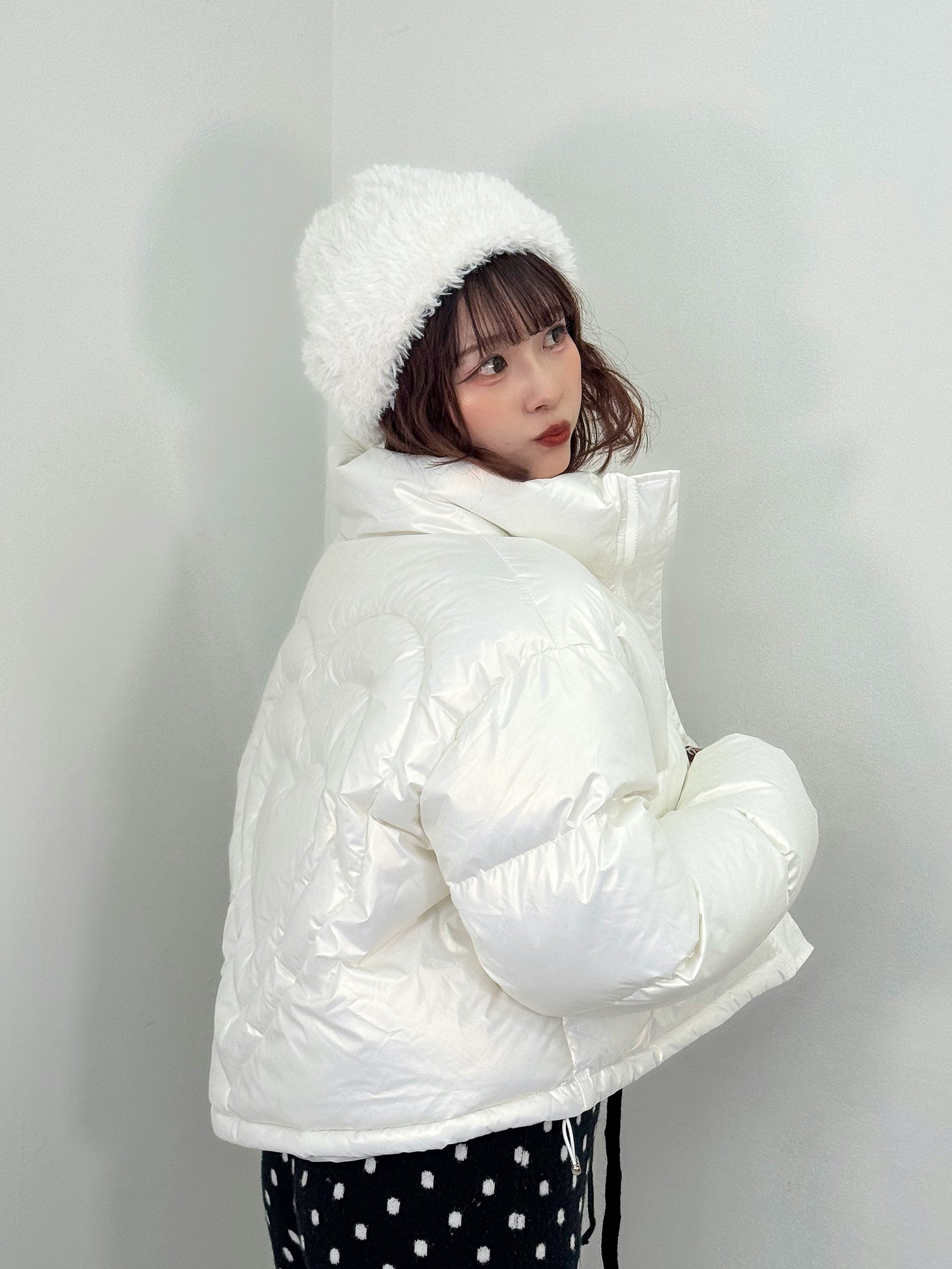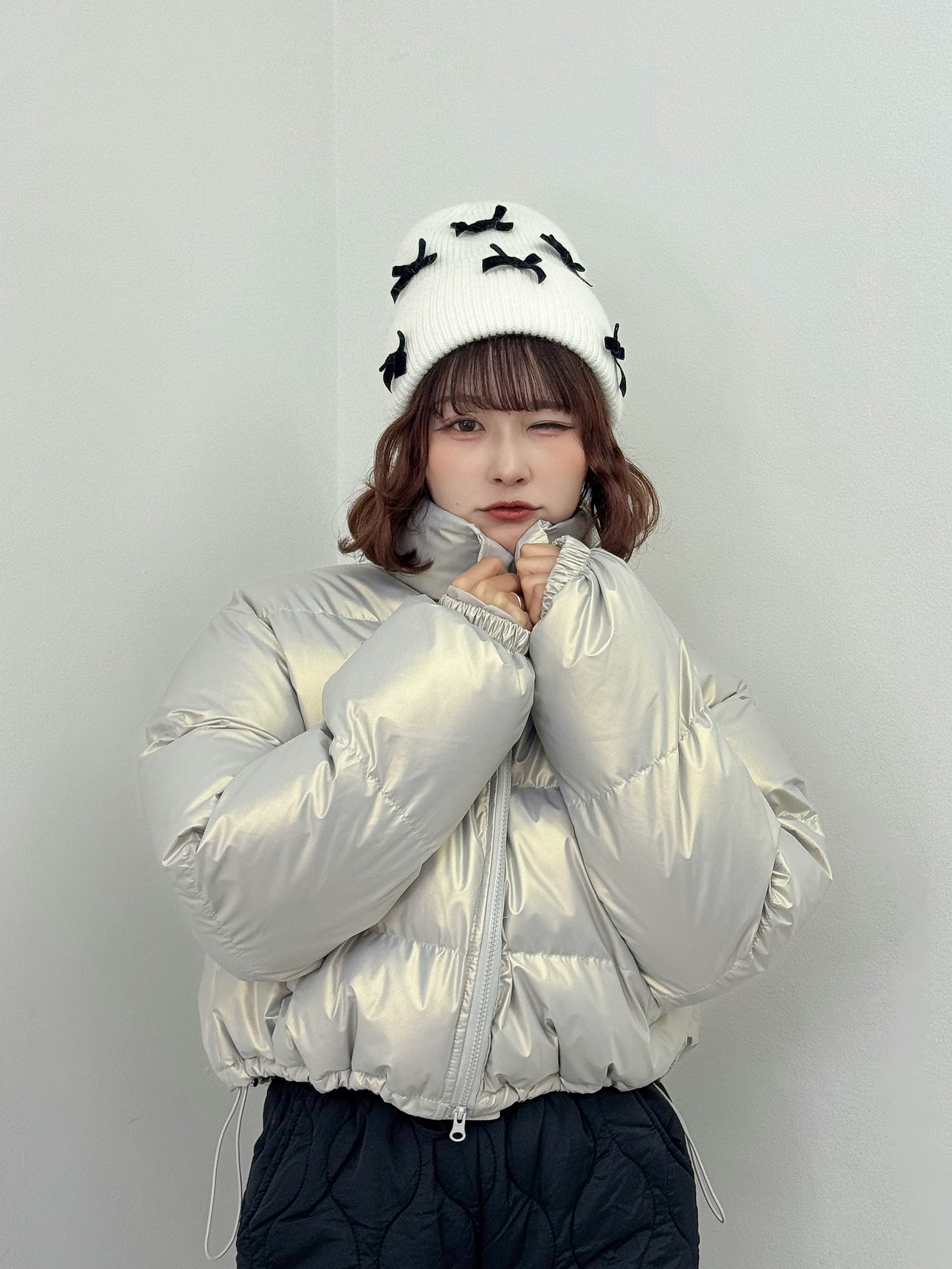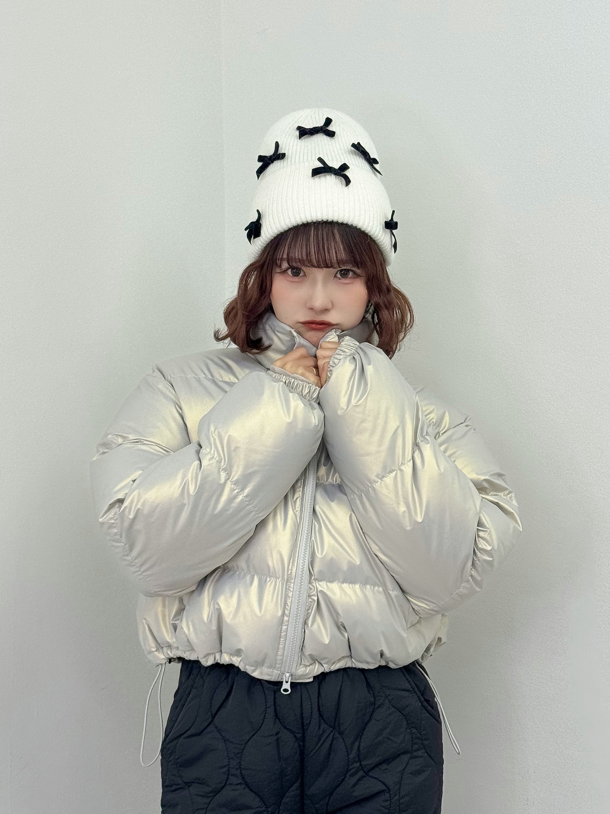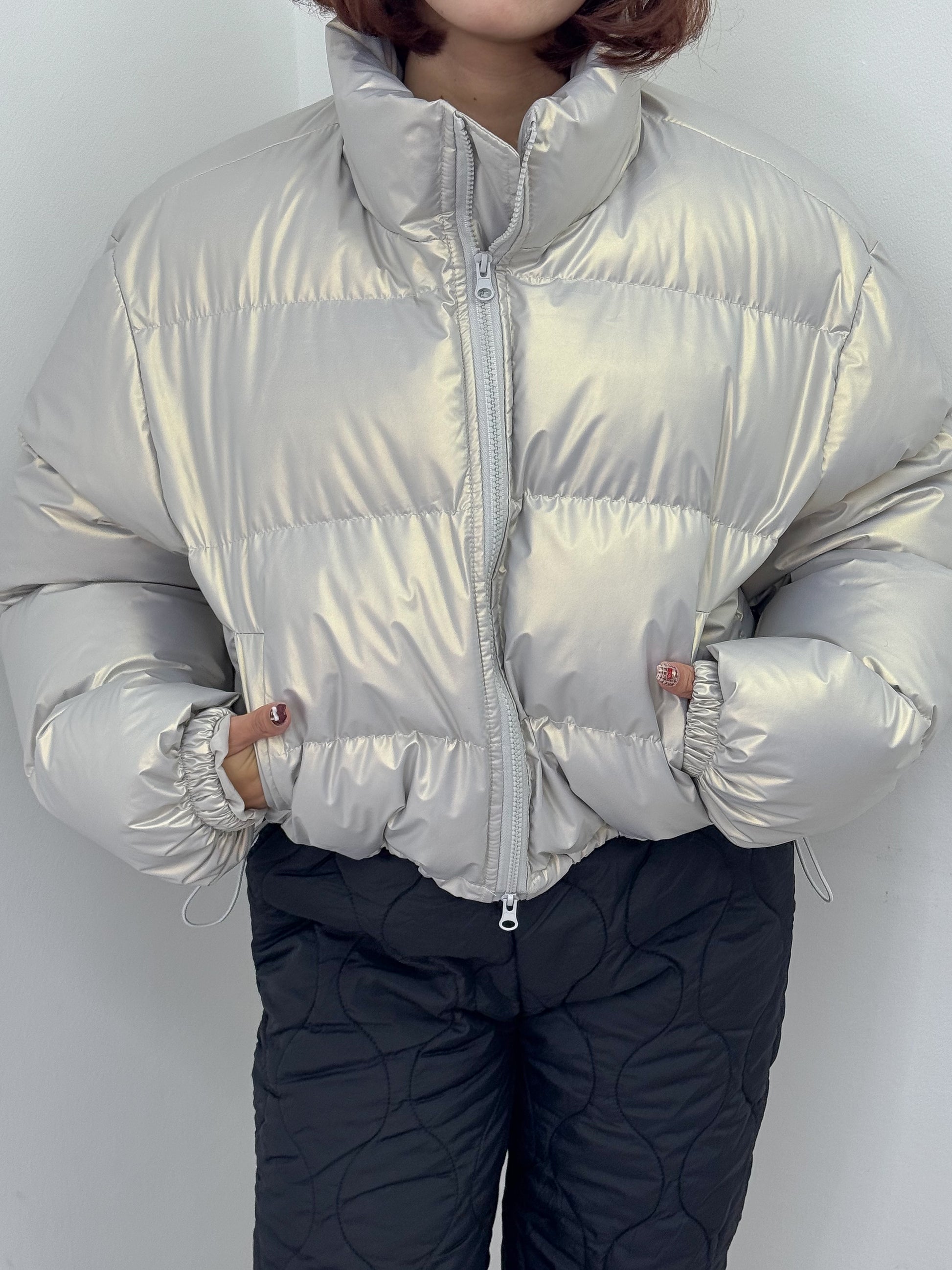 オーロラのような光沢感のある中綿アウター。