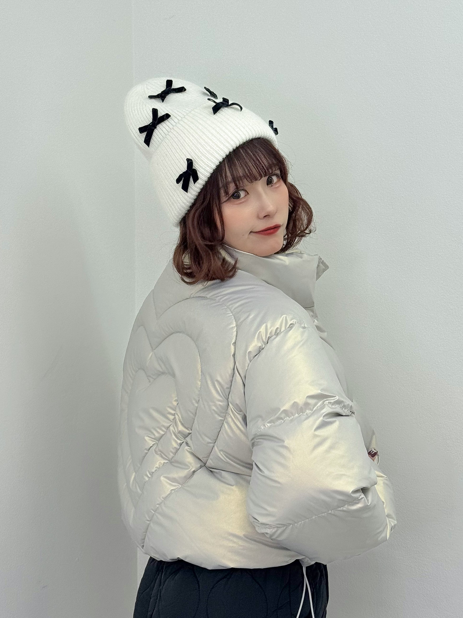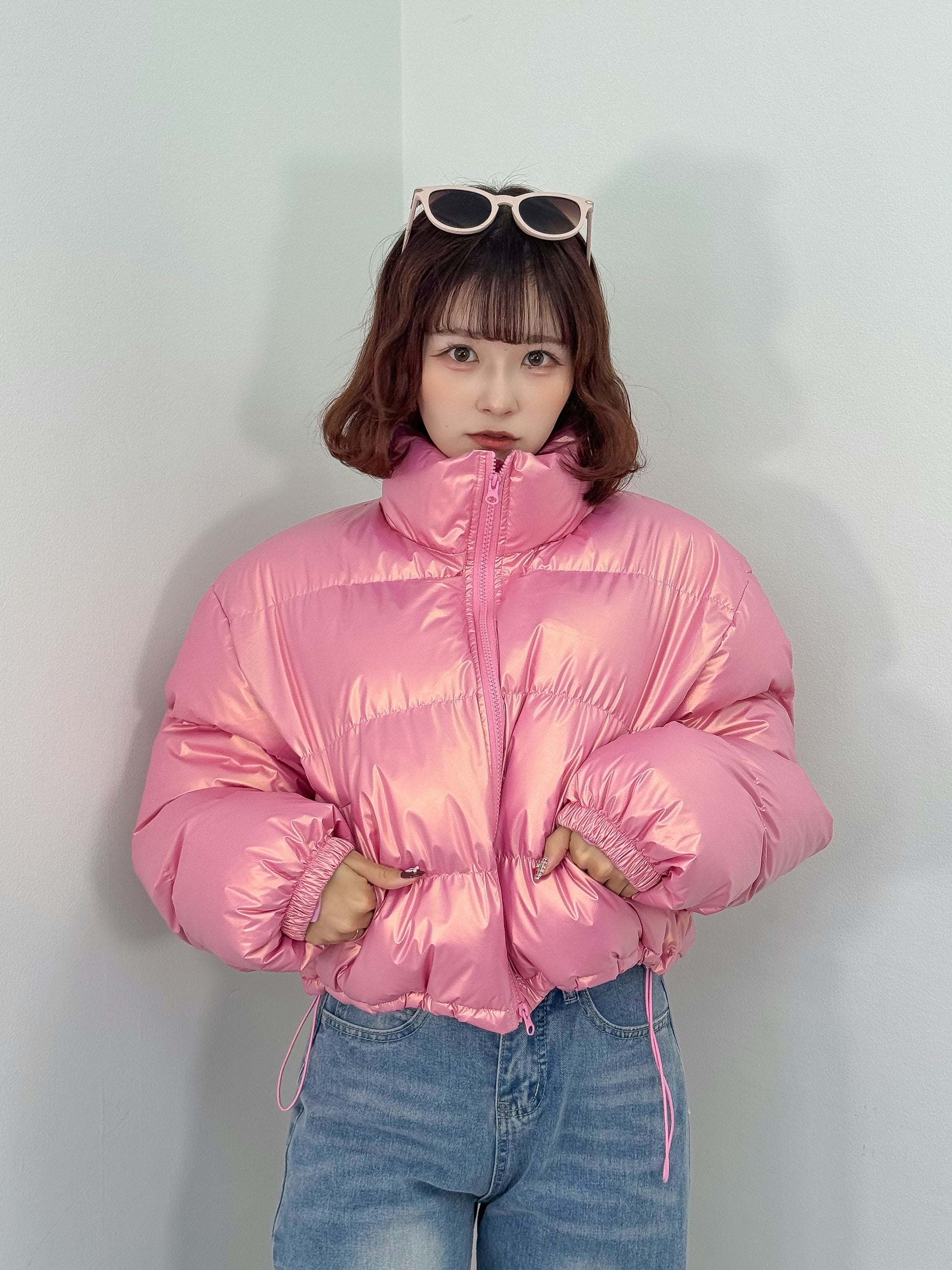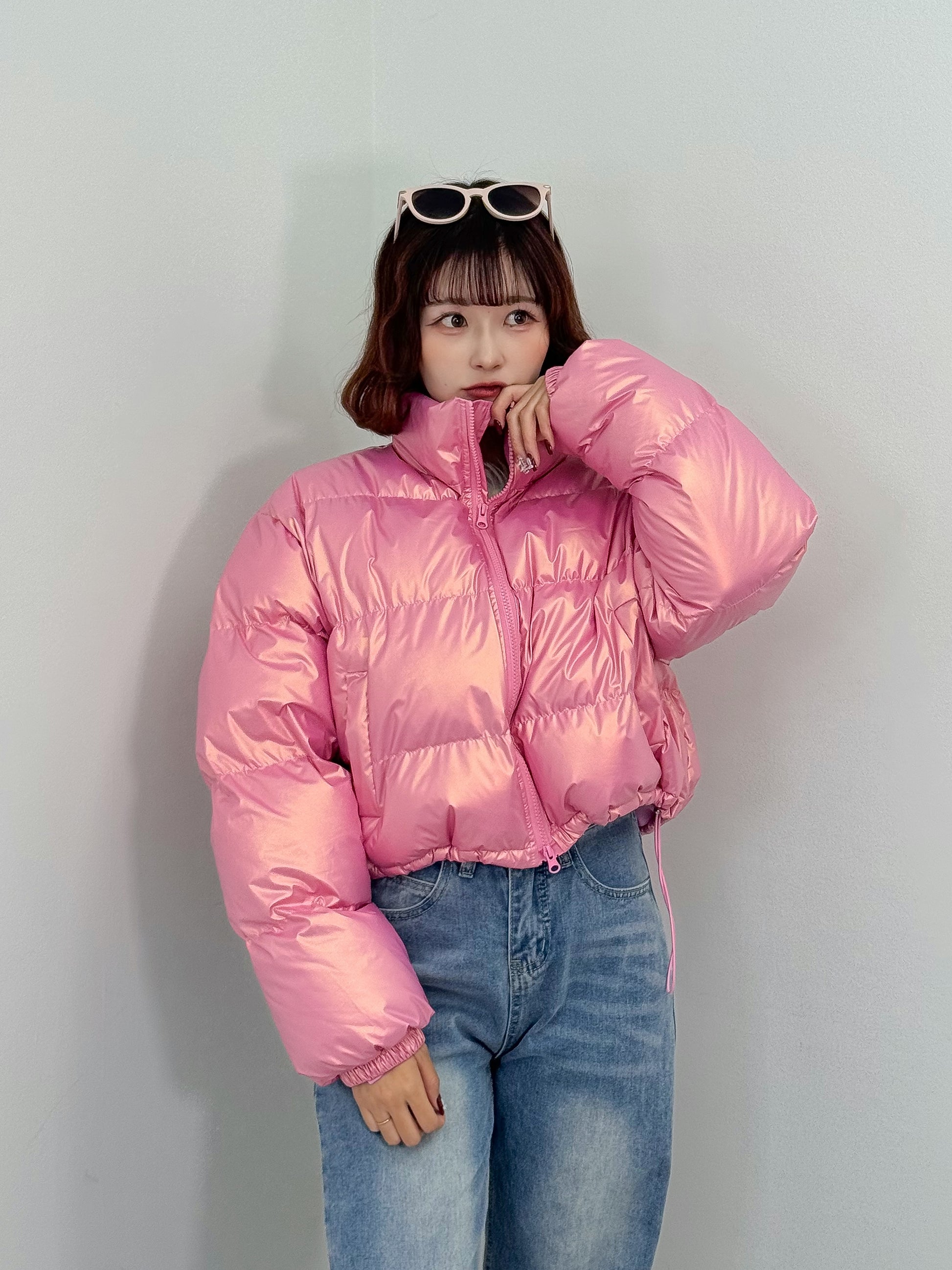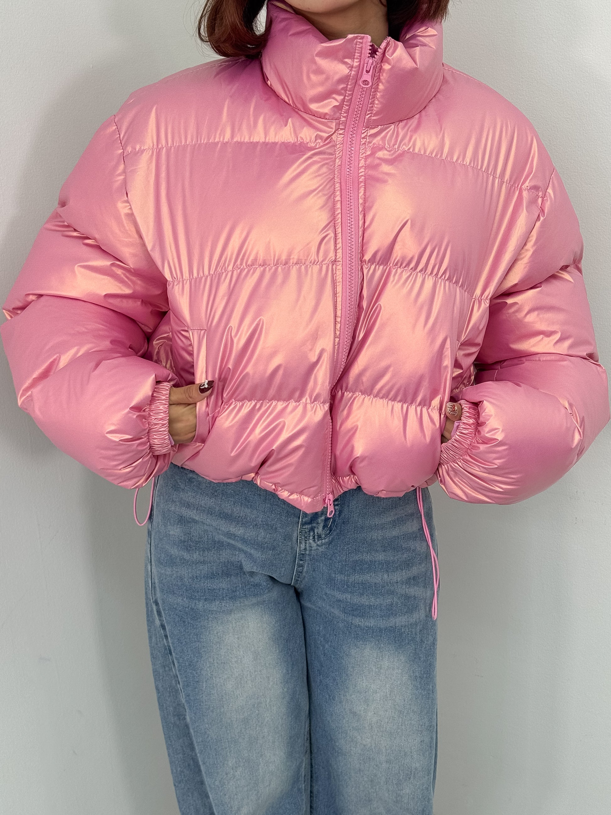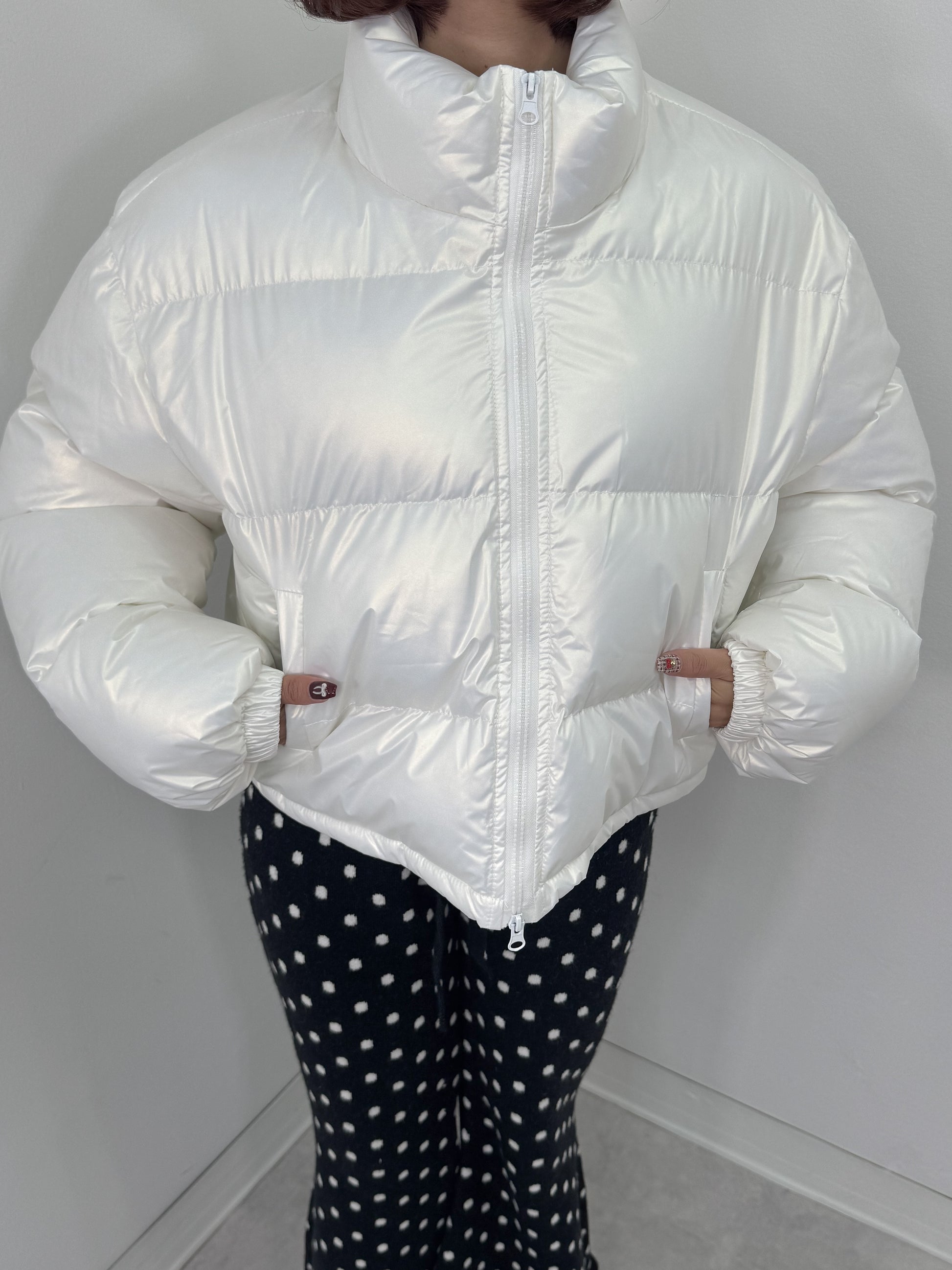 オーロラのような光沢感のある中綿アウター。