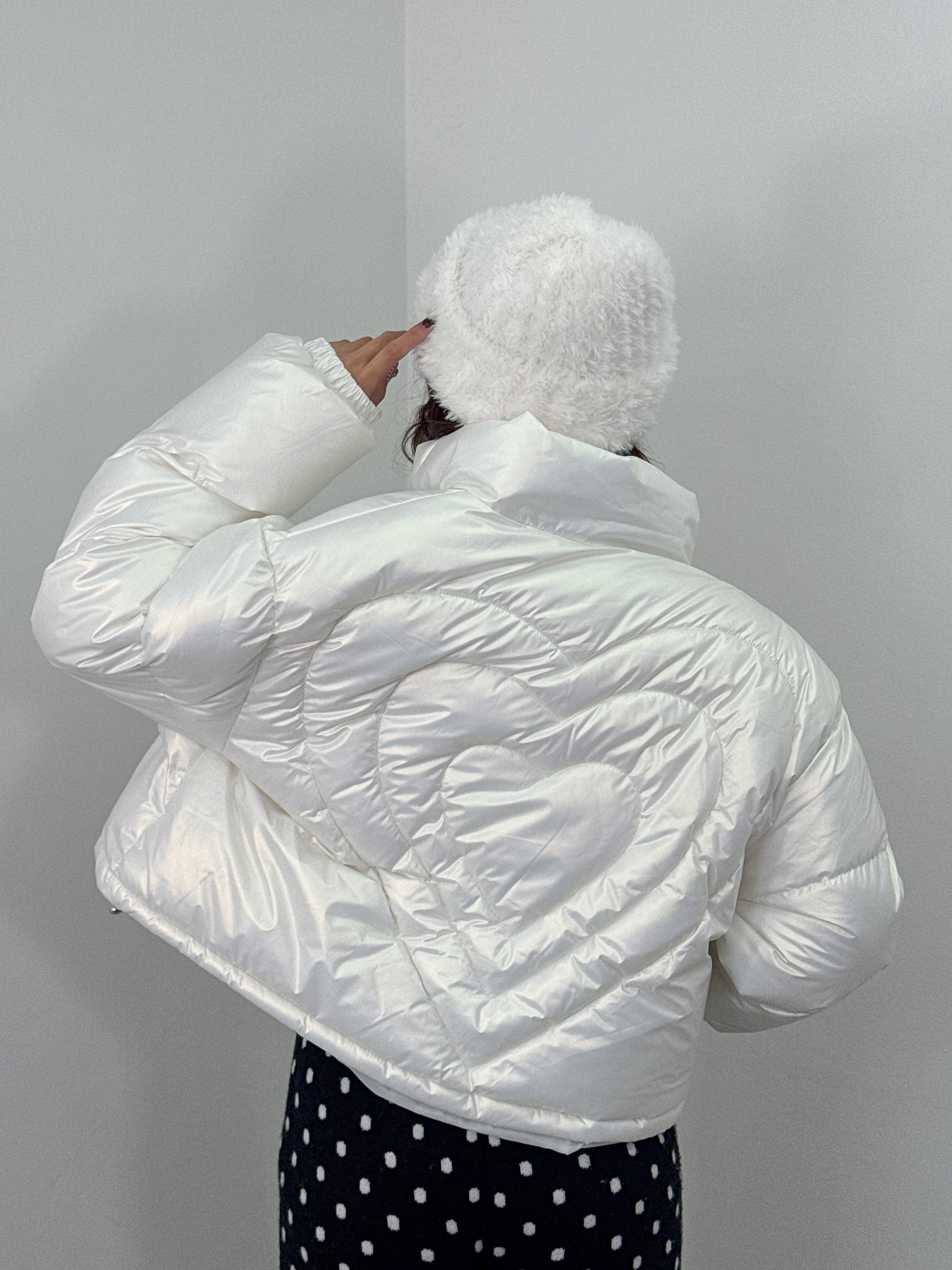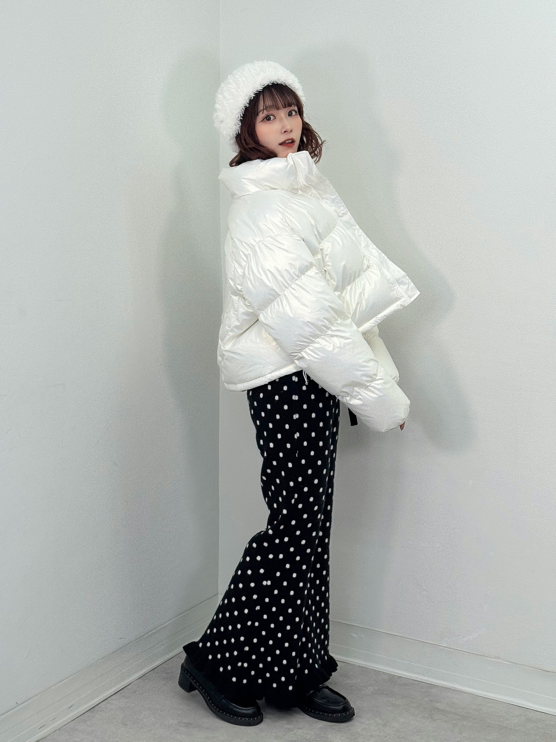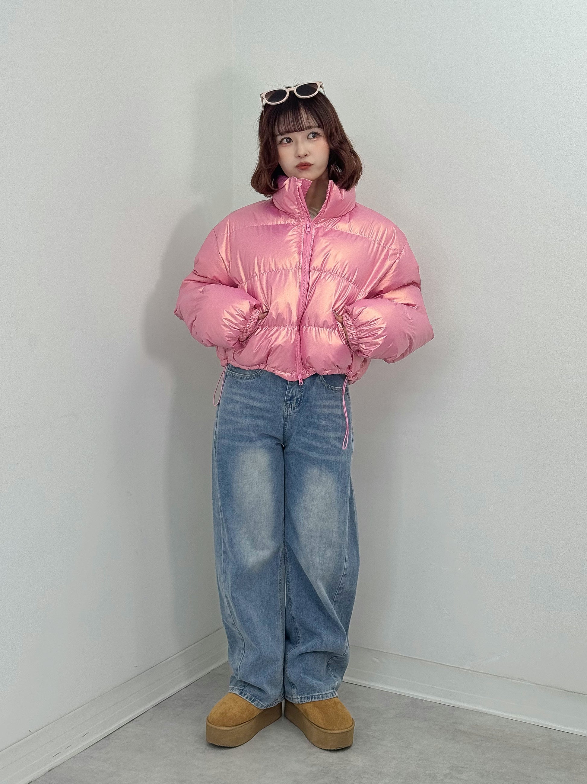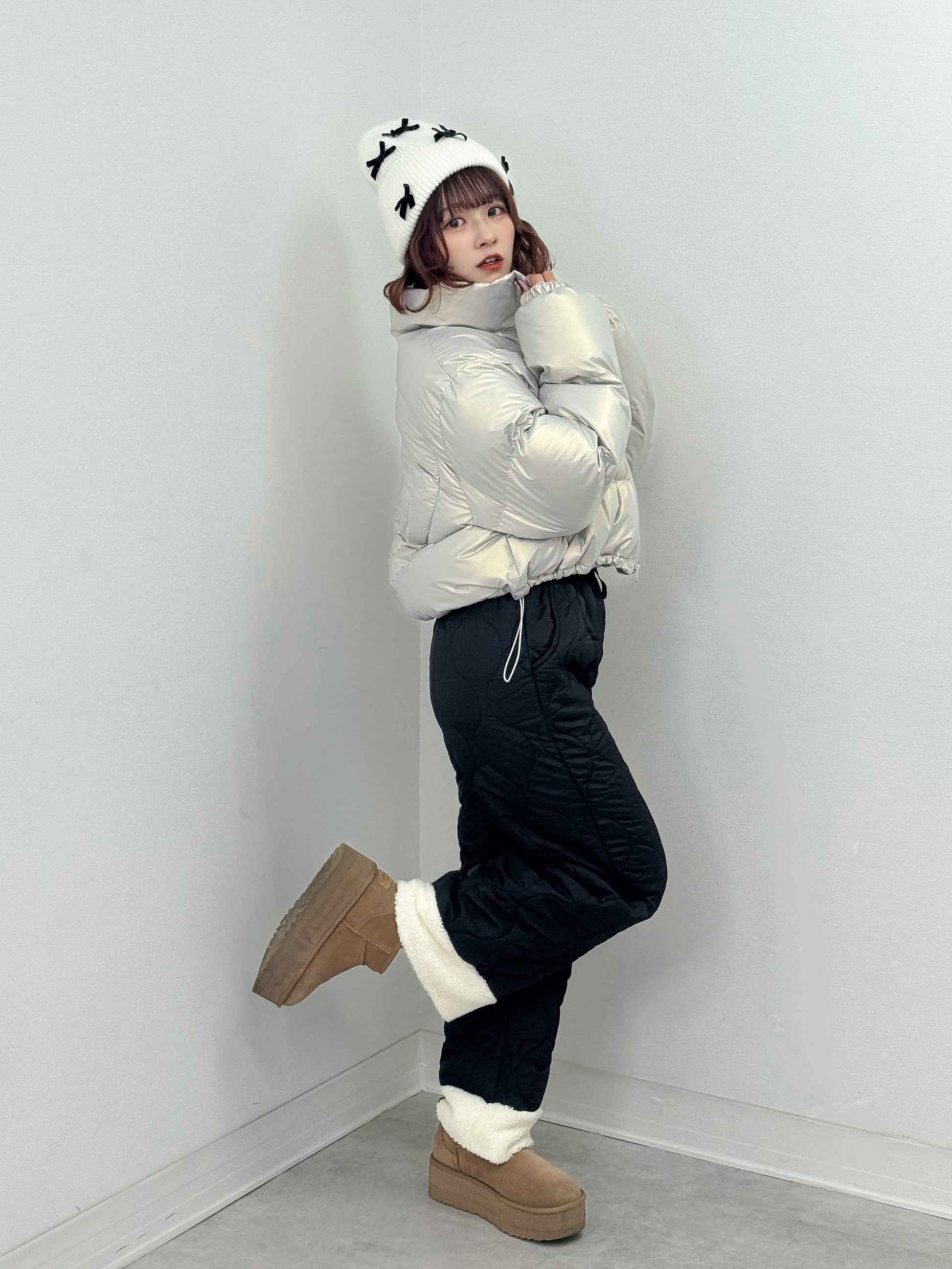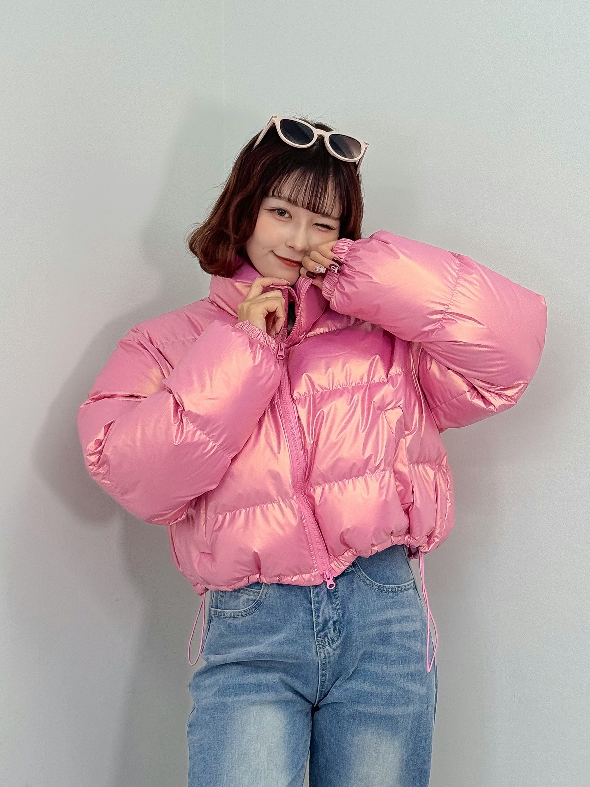 オーロラのような光沢感のある中綿アウター。